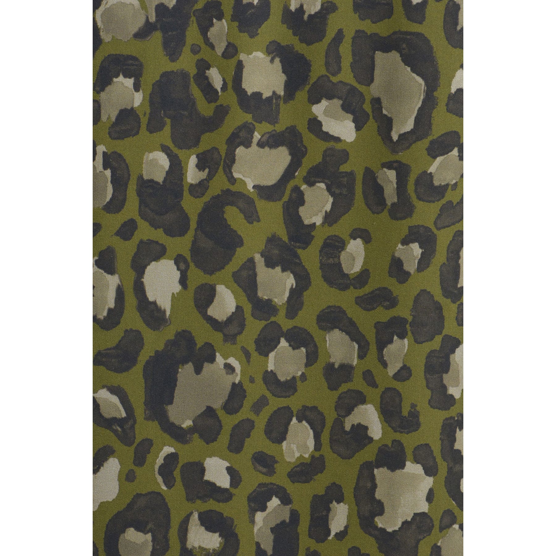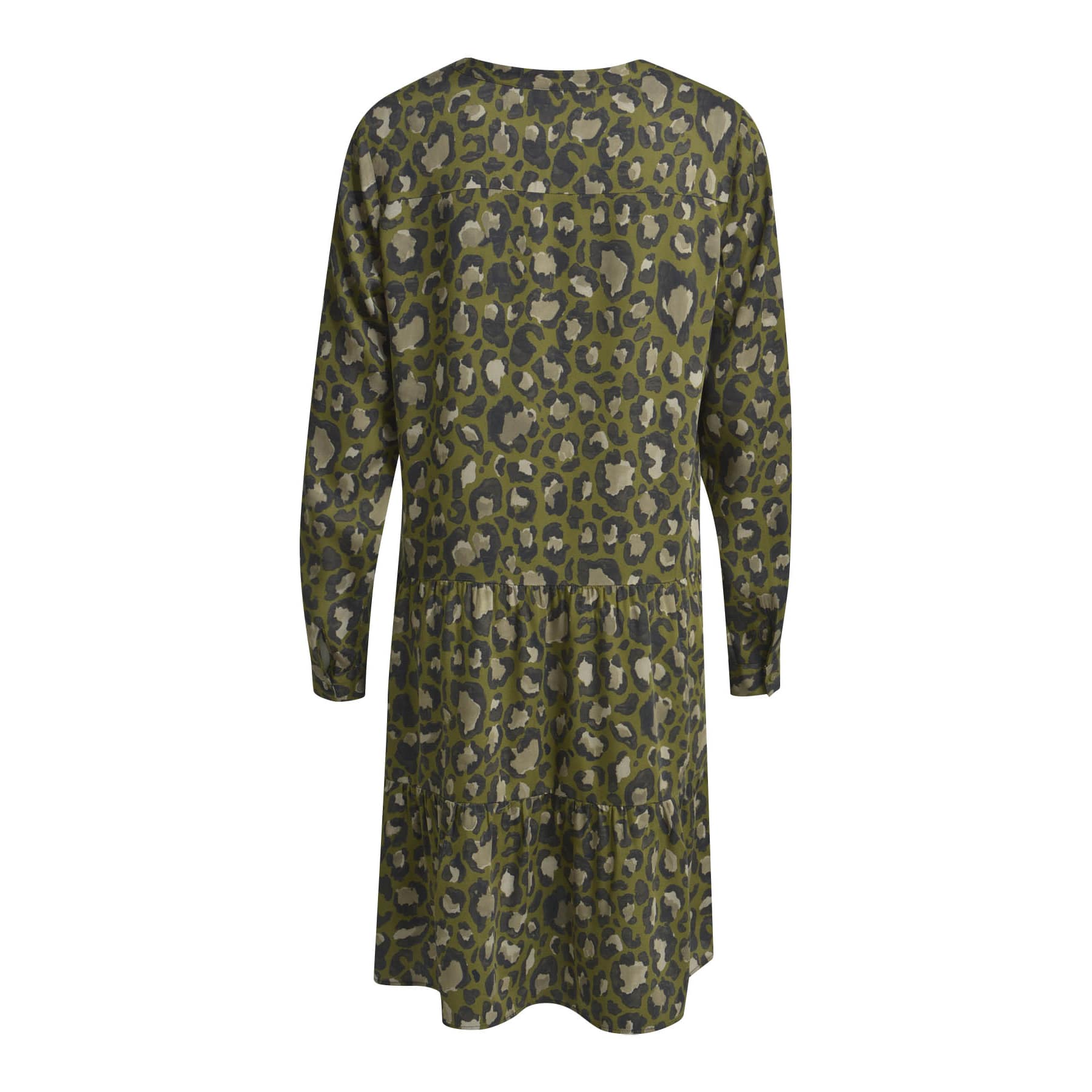 Groen kleedje van Milano Italy in khaki print. Deze jurk is gemaakt van een viscose stof met een groene basis met een luipaard motief en heeft lange mouwen. De jurk sluit met een korte knoopsluiting aan het einde van de V-hals, heeft een verhoogde taille en valt boven de knie.