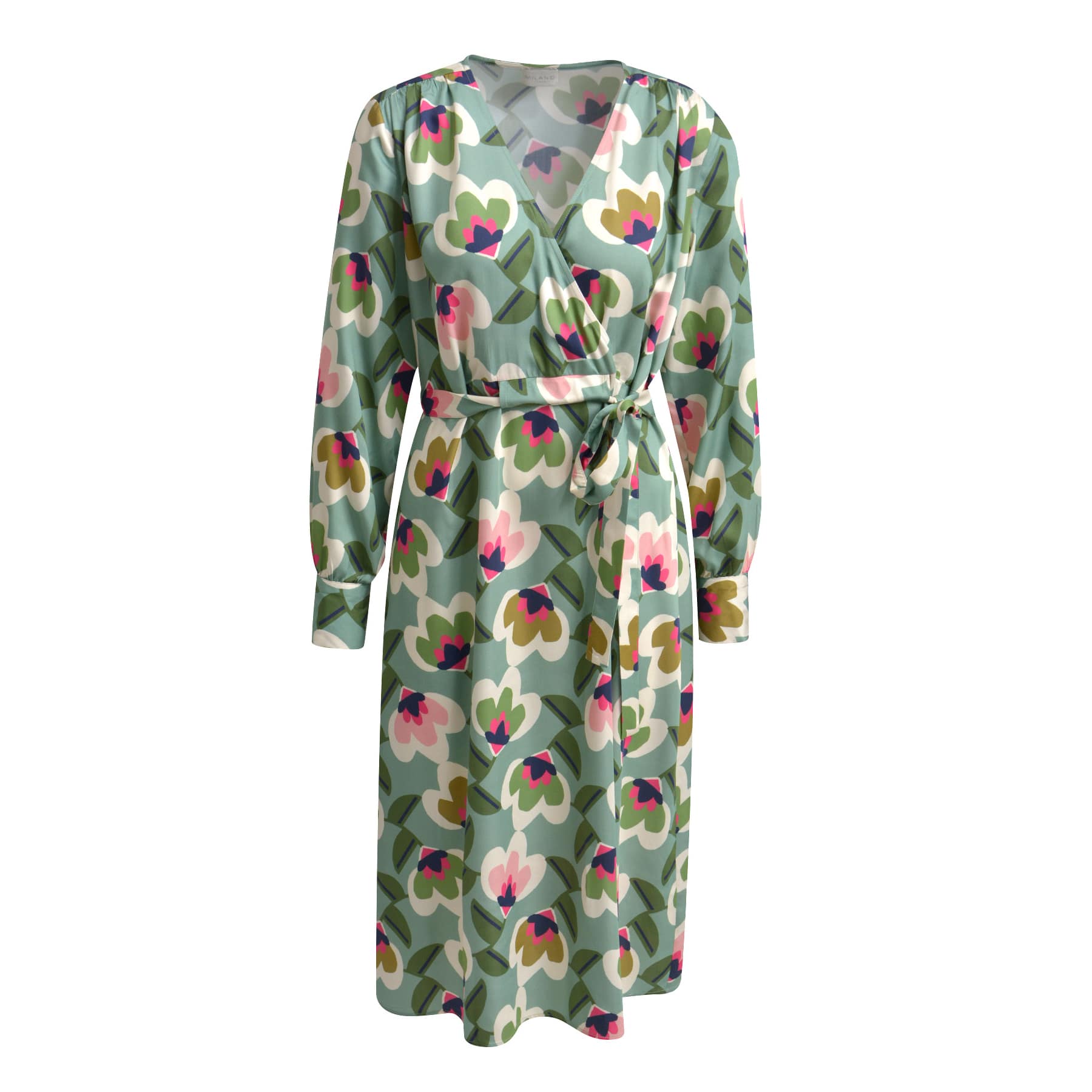 Midi kleedje van Milano Italy in sage print. Deze jurk is gemaakt van een viscose stof met een groene basis met een roze, off white en blauwe bloemen print en heeft lange mouwen. De jurk heeft een vaste overslag, bijpassende ceintuur en valt over de knie.