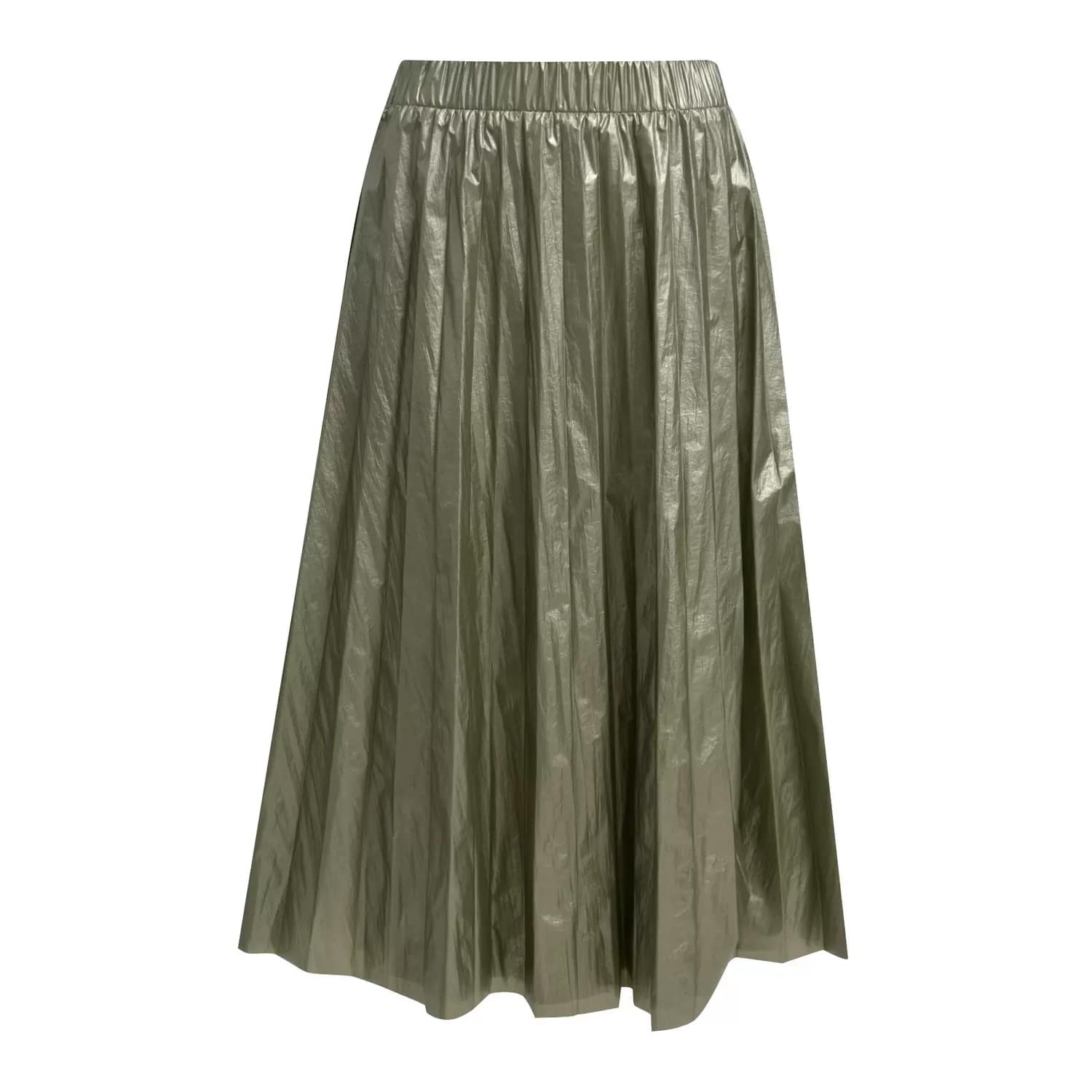 Olijf groene rok van Milano Italy. Deze geplooide rok is gevoerd en gemaakt van een gemaakt van een licht glanzende soort parachute stof en valt tot over de knie. De rok heeft een elastische taille en een uitlopende pasvorm.
