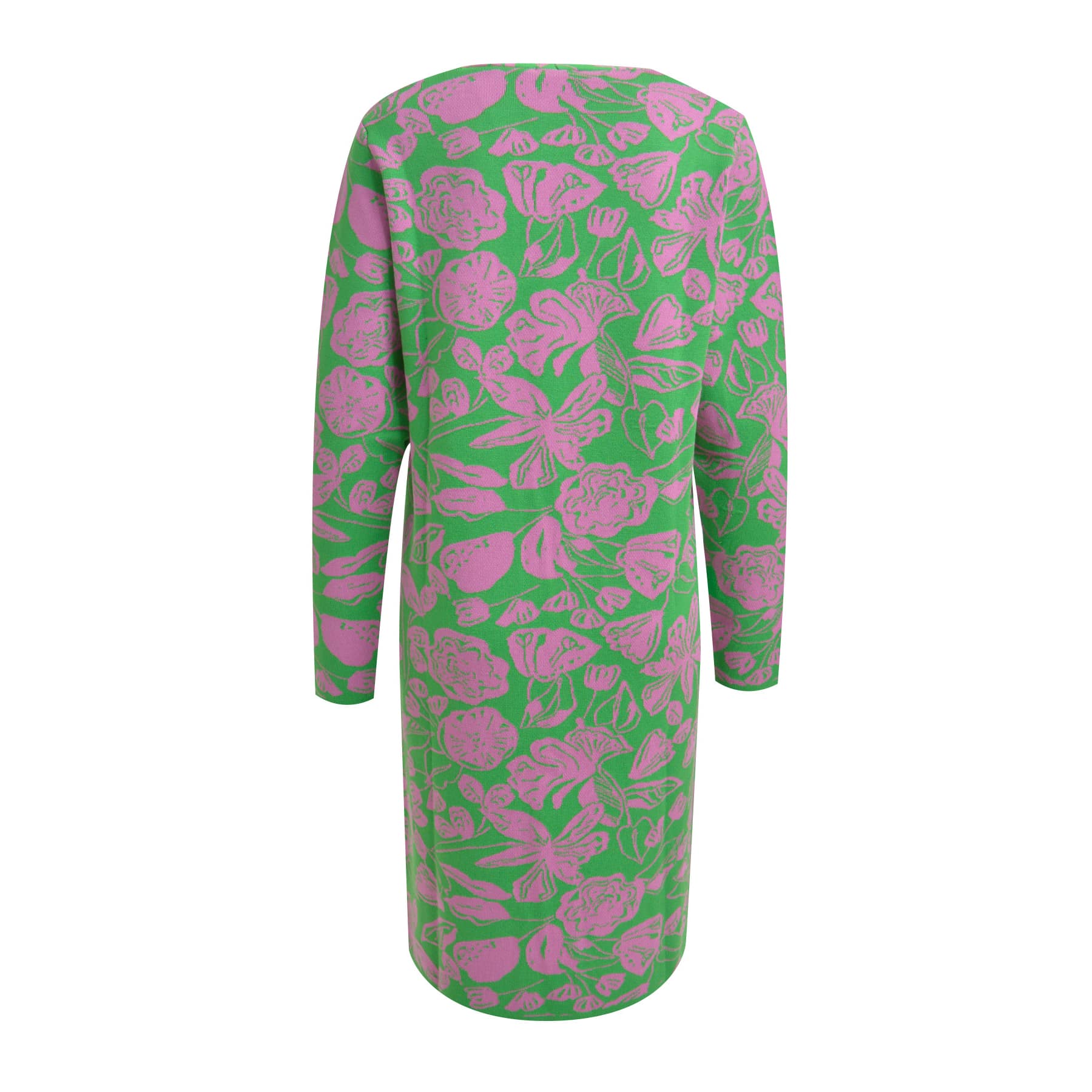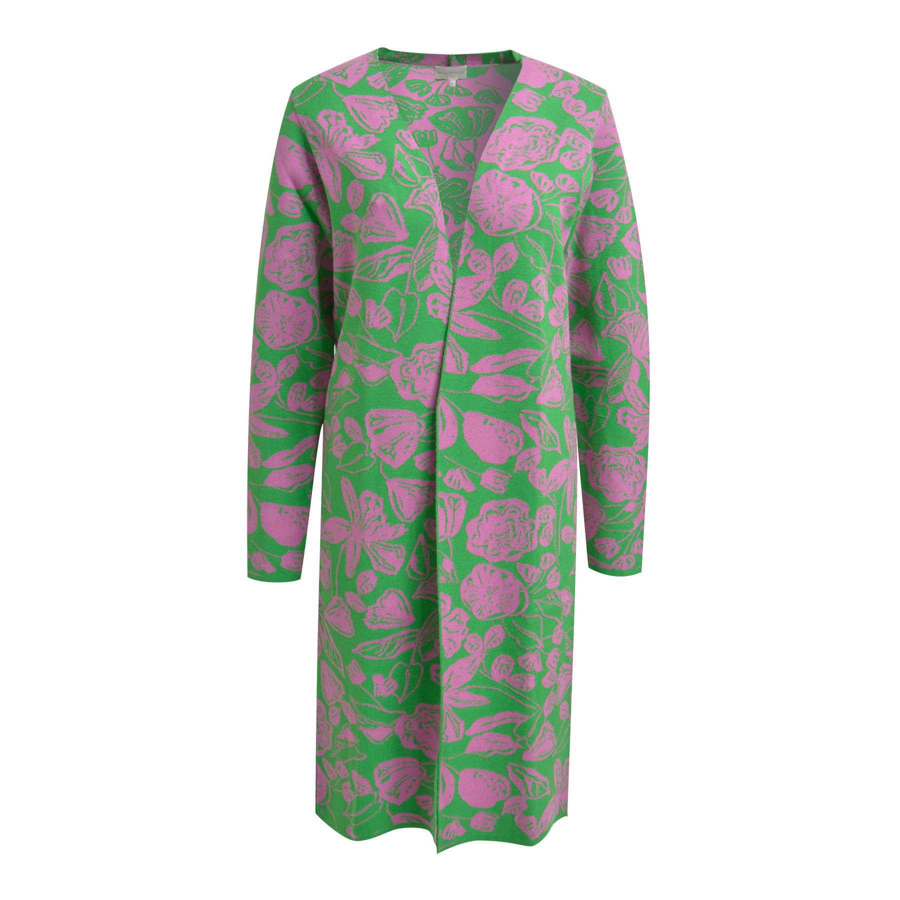 Lange cardigan van Milano Italy. Dit fijn gebreide vest is gemaakt van een groene, viscose stretch stof met een roze print . Het vest heeft een openvallende voorzijde en een relaxte pasvorm.