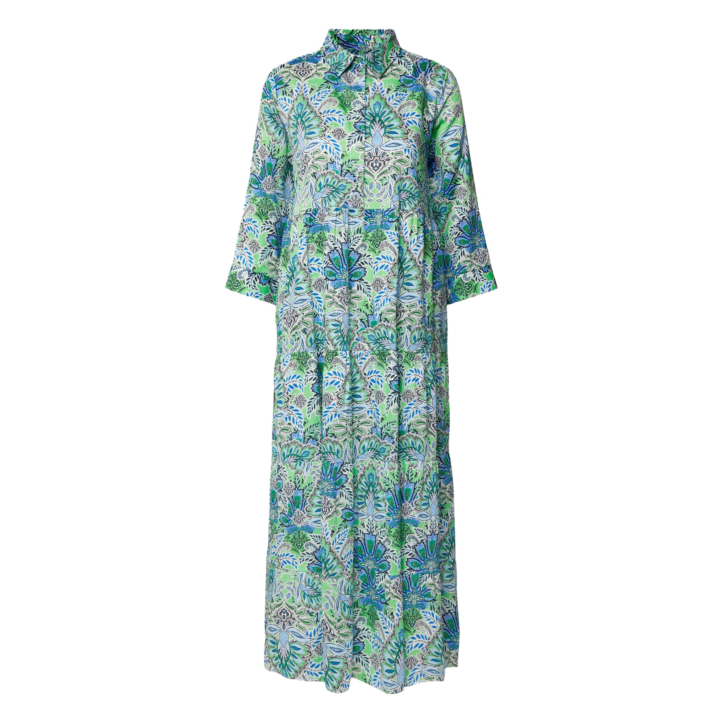 Losvallend maxi kleedje van Milano Italy met apple print. Deze jurk heeft een bloemen print in groen, wit en blauw, heeft twee steekzakken en valt op de enkels. De jurk sluit aan de voorzijde met knoopjes, heeft een klassieke kraag en driekwart mouwen.