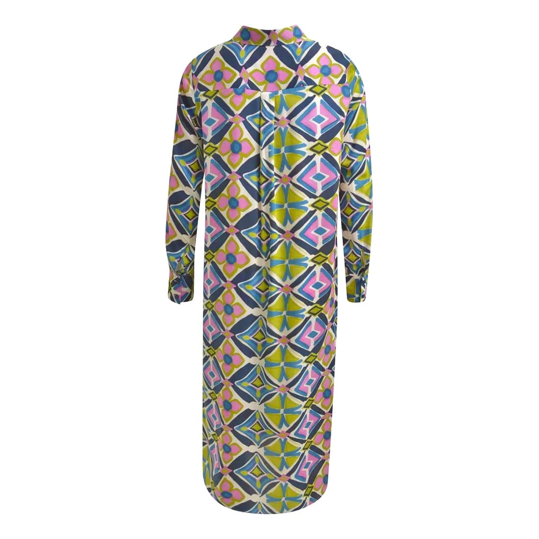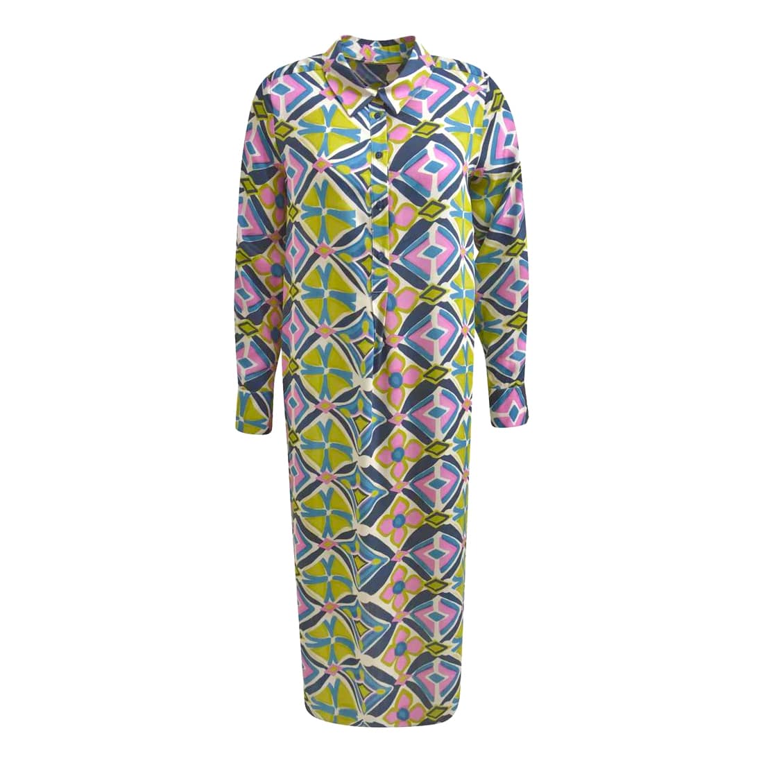 Losvallend kleedje van Milano Italy met lime print. Deze jurk heeft een print met groen, roze, blauw en off white en valt op de kuiten. De jurk sluit aan de voorzijde met knoopjes, heeft een klassieke kraag en lange mouwen.