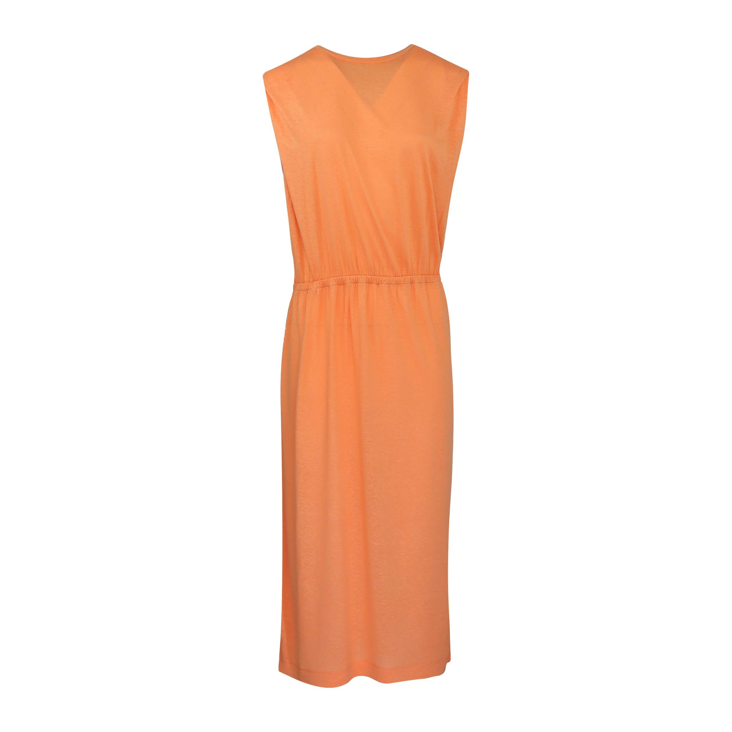 Losvallend midi kleedje van Milano Italy in mandarin. Deze jurk is gemaakt van een viscose en linnen mix en heeft een losvallende pasvorm. De jurk is mouwloos, heeft een elastische taille, ronde hals en splitjes aan beide zijde van de rok.