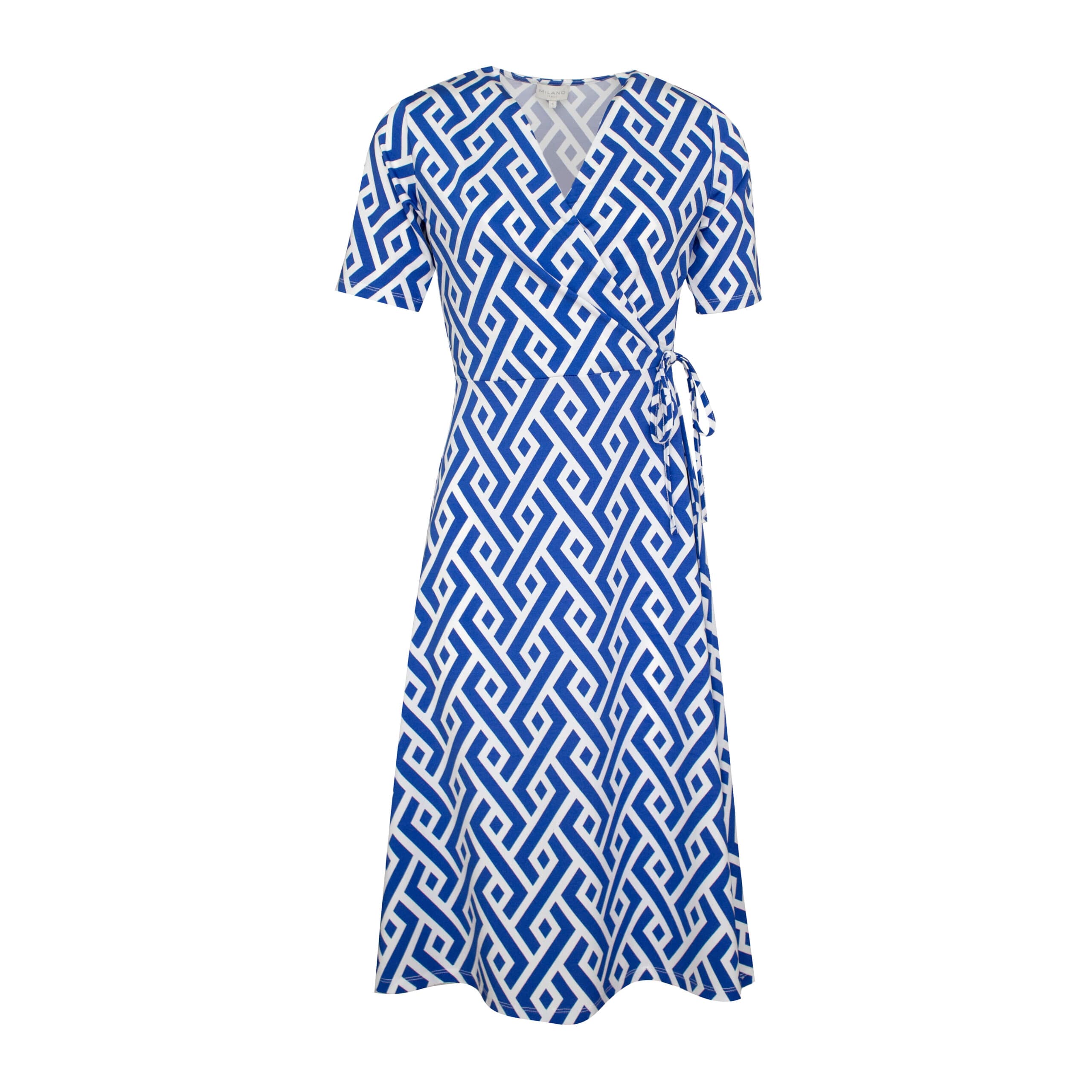Midi kleedje van Milano Italy in santorini print. Deze jurk is gemaakt van een gladde stretch stof met een blauw, wit santorini motief en heeft korte mouwen. De jurk heeft een vaste overslag en valt op de knie.