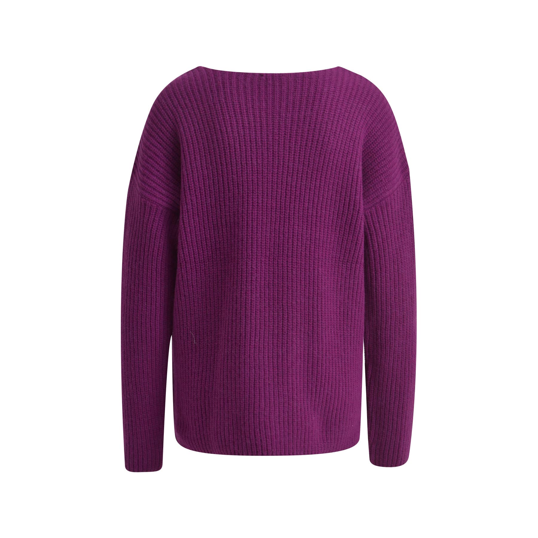 Paarse pull van Milano Italy in berry. Deze geribbelde, gebreide trui is gemaakt van een mix met alpaca wol en heeft een los vallende pasvorm. De trui heeft lange mouwen en een V-hals.