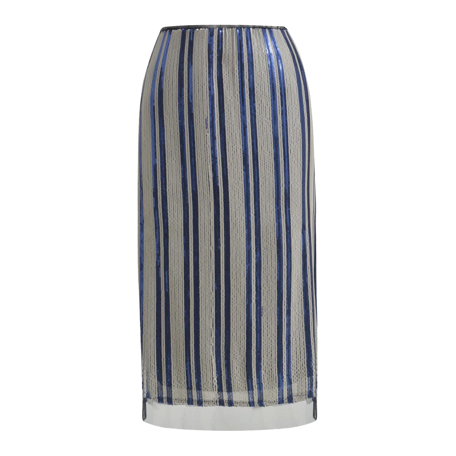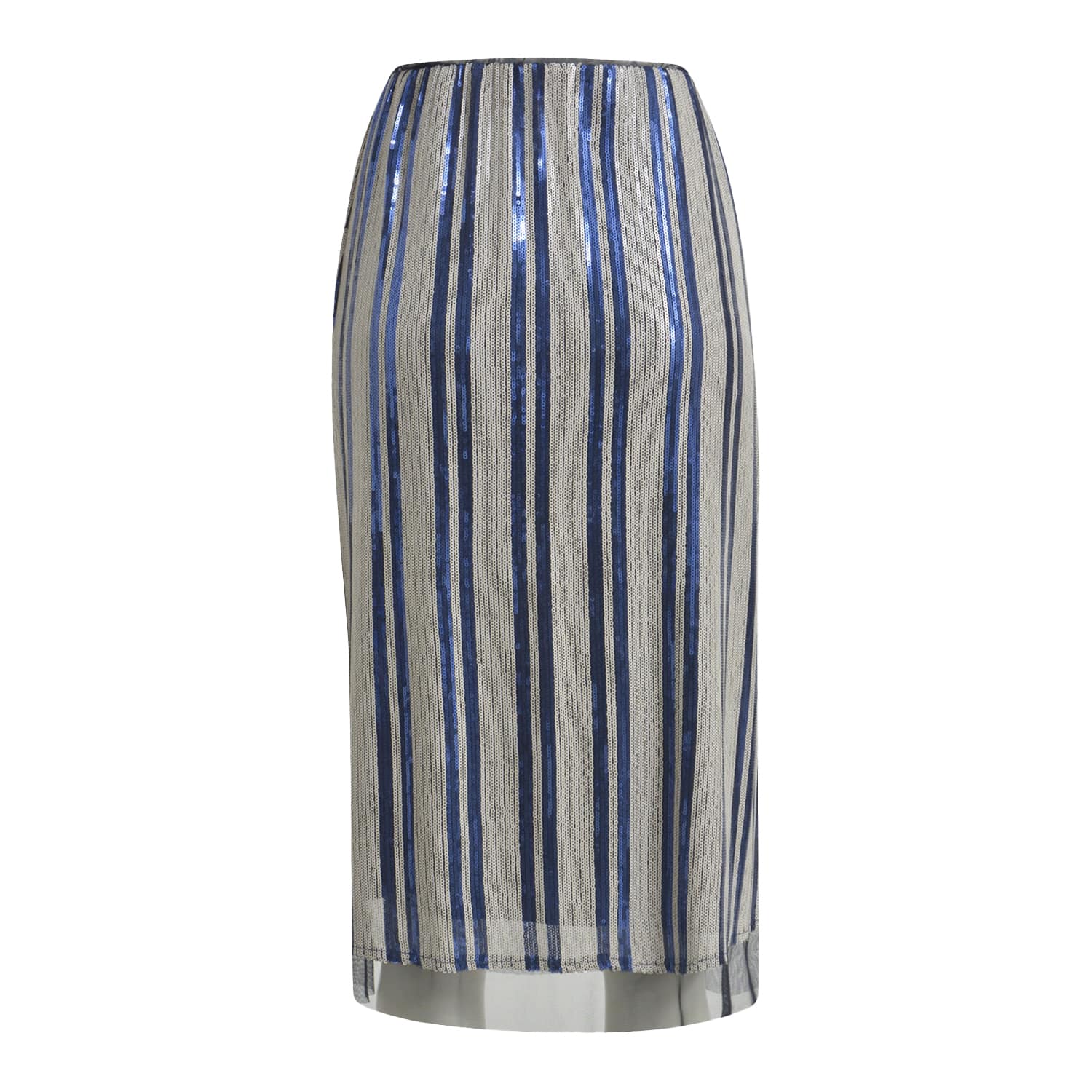 Gestreepte rok van Milano Italy. Deze rok is gevoerd en geheel bezet met witte en blauwe pailletten met aan de onderzijde een zwarte strook tule. De rok heeft een elastische taille, rechte pasvorm en valt over de knie.
