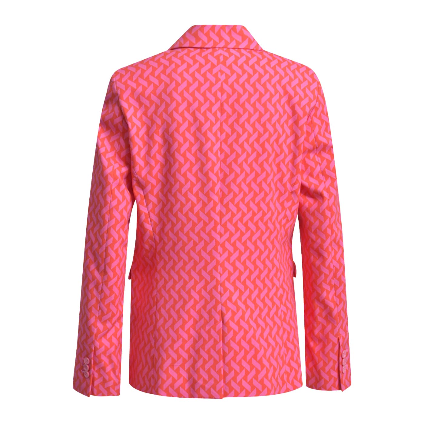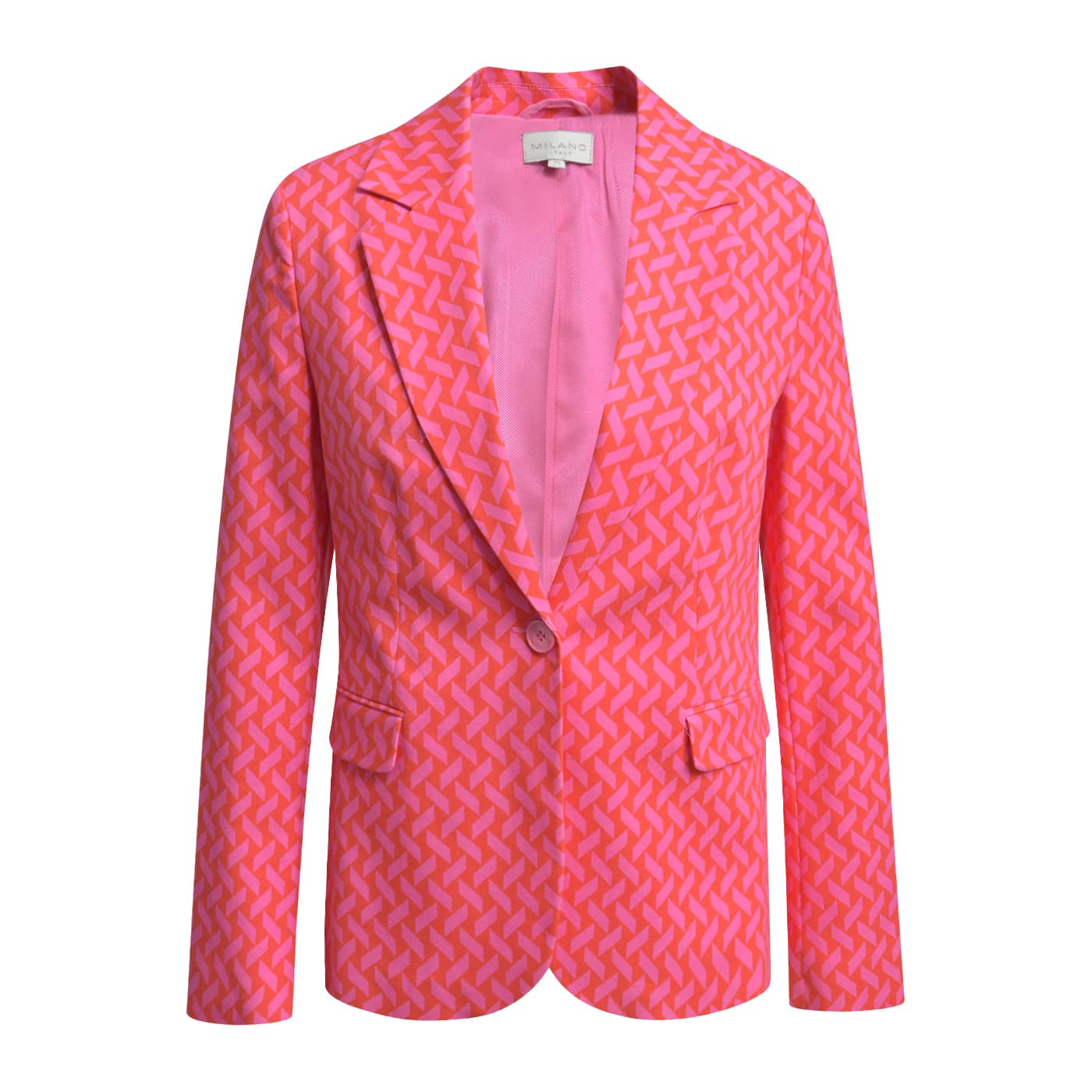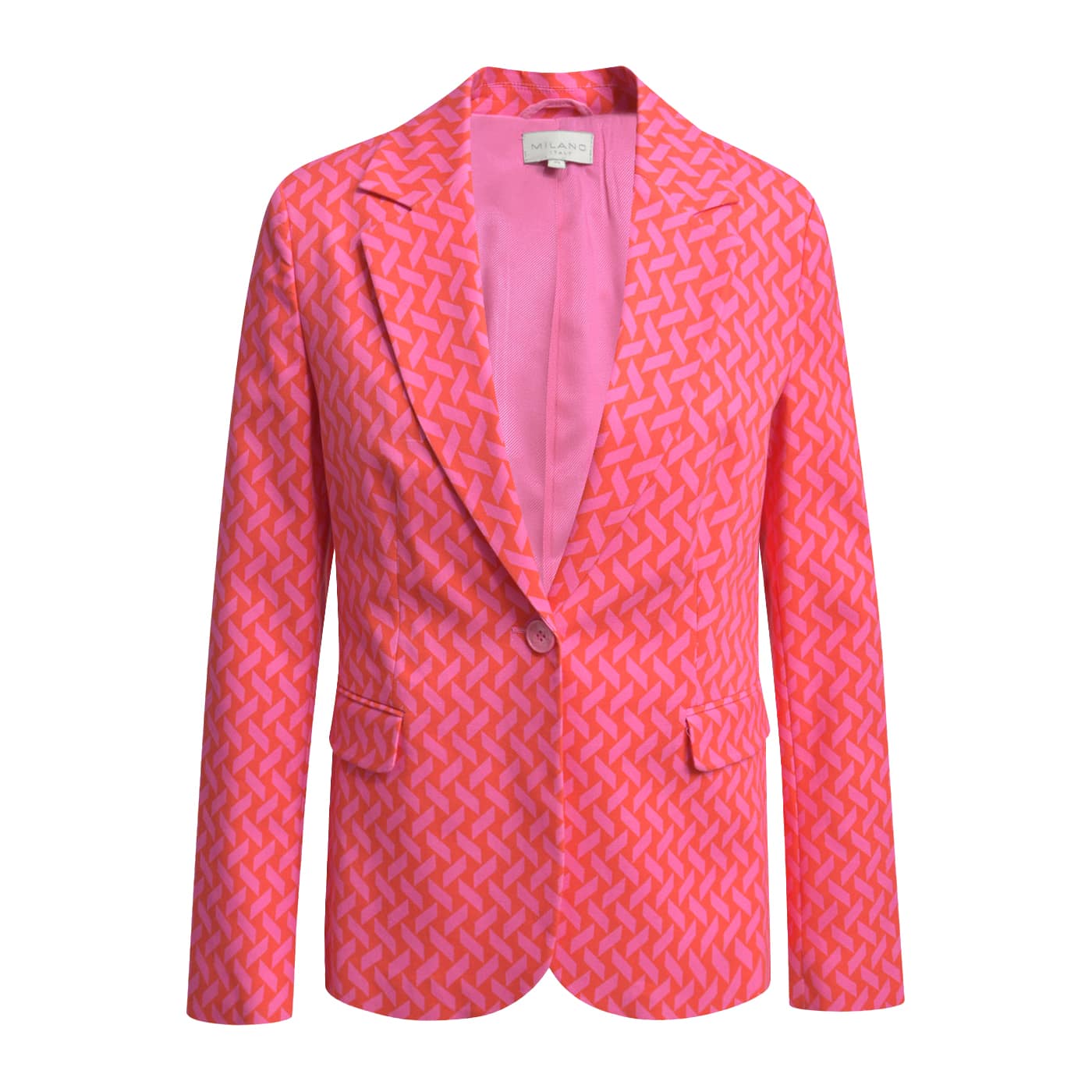 Rood, roze blazer van Milano Italy in poppy print. Deze gevoerde blazer heeft een effen rode basis met hierop een rode print. De blazer sluit met een knoop aan de voorzijde, heeft een klassieke kraag, kleine schoudervullingen en twee klepzakjes.