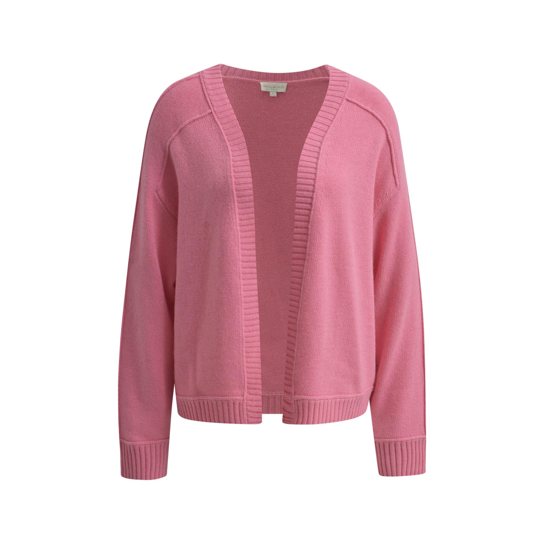 Roze cardigan van Milano Italy. Dit gebreide vest is gemaakt van een mix met kasjmier en merino wol en heeft effen roze kleur. Het vest heeft een openvallende voorzijde en een relaxte, boxy pasvorm.