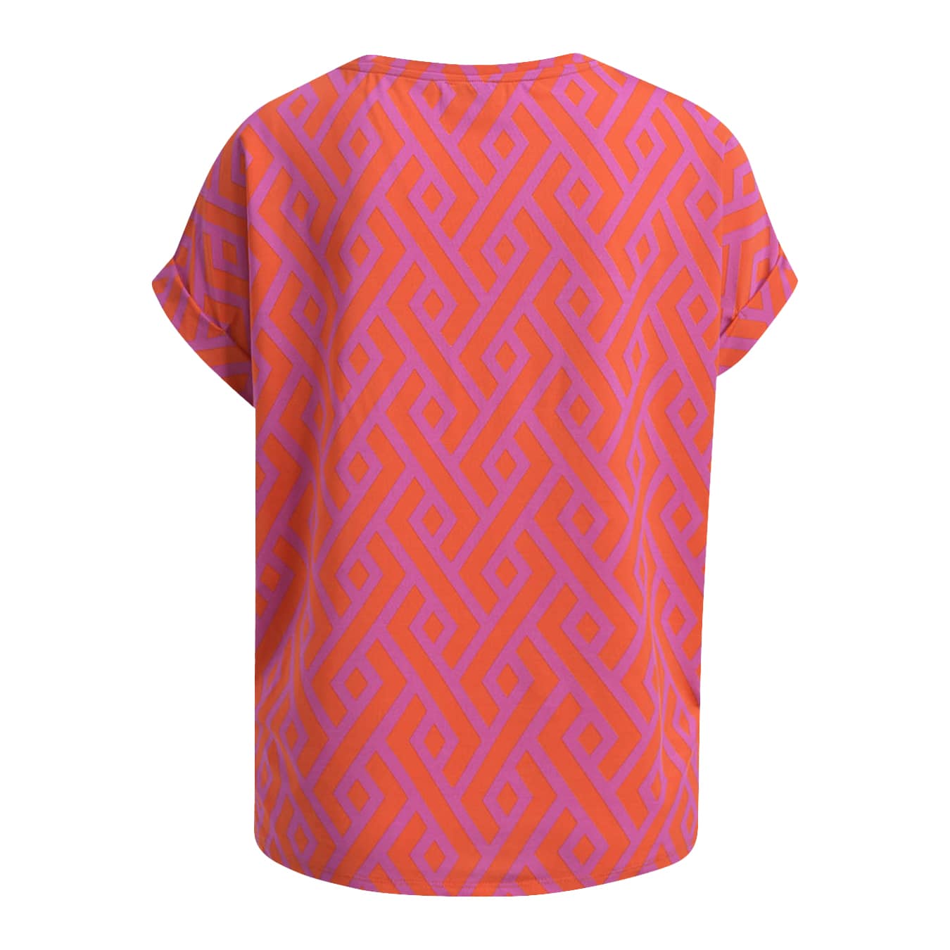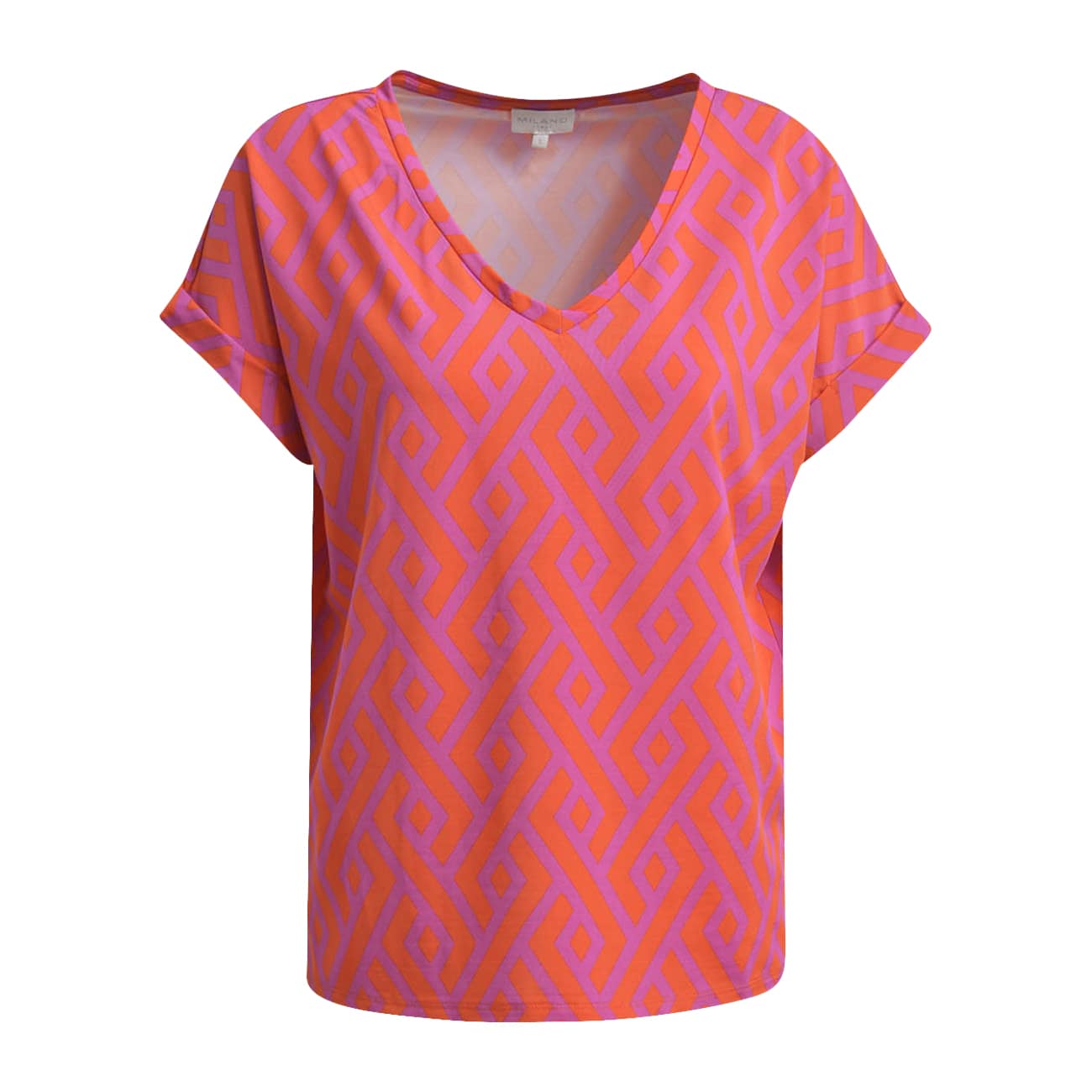 Shirt van Milano Italy in neon pink. Dit shirt is gemaakt van een gladde rayon stof en heeft een oranje met roze motief. Het shirt heeft een V-hals, korte mouwen en een losvallende pasvorm.