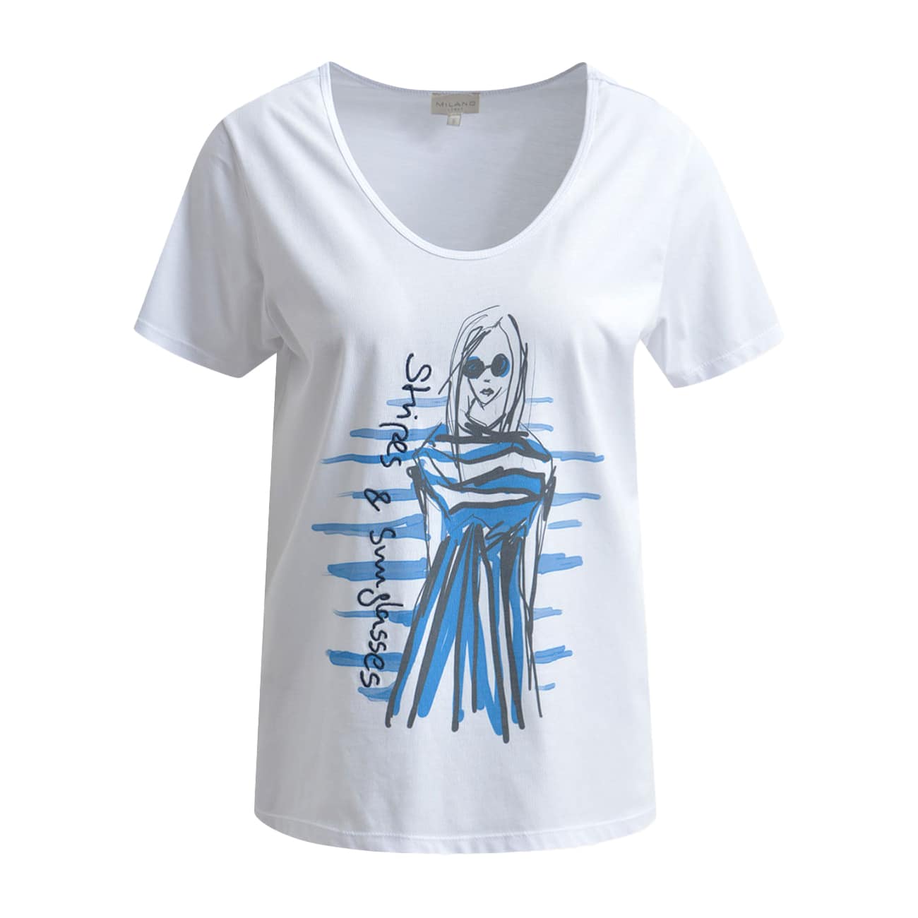 Wit t-shirt van Milano Italy. Dit shirt is gemaakt van katoen en heeft een blauw, zwarte tekening van een dame met de geborduurde woorden stripes & sunglasses. Het t-shirt heeft een ronde hals, korte mouwen en een normale pasvorm.