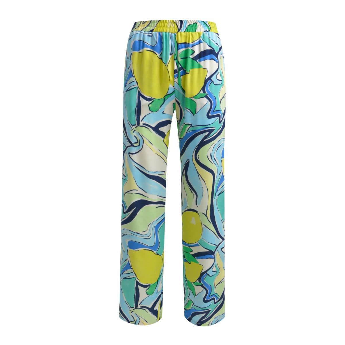 Relaxte pantalon van Milano Italy, model blue curacao print. Deze broek is gemaakt van een soepelvallende stof met een bloemen print in roze, oranje en geel. De broek heeft een rechte wijde broekspijpen, elastische taille en twee steekzakken.