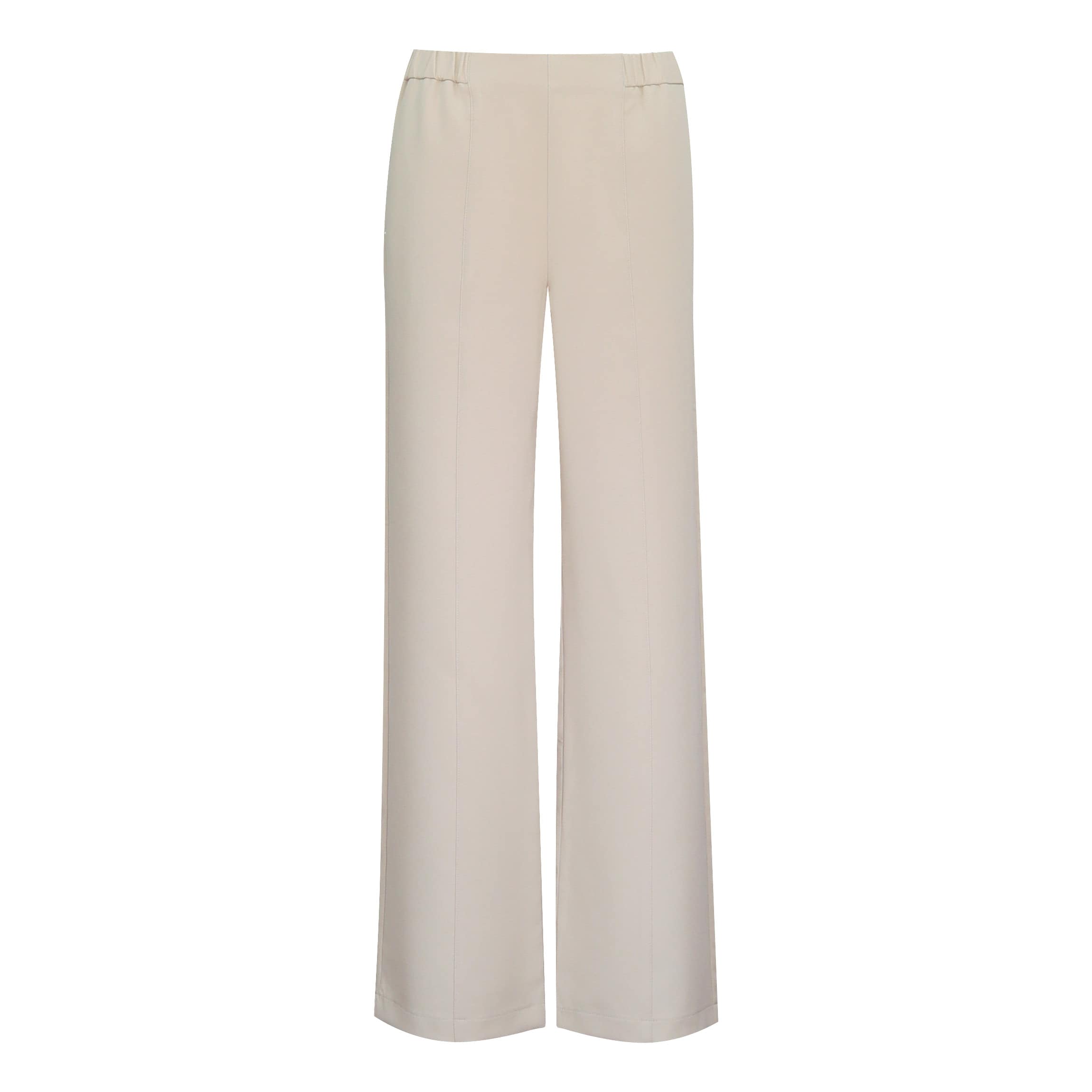 Rechte pantalon van Milano Italy. Deze broek is gemaakt van een effen beige stof. De broek heeft een rechte, wijde broekspijpen, elastische taille en twee steekzakken.