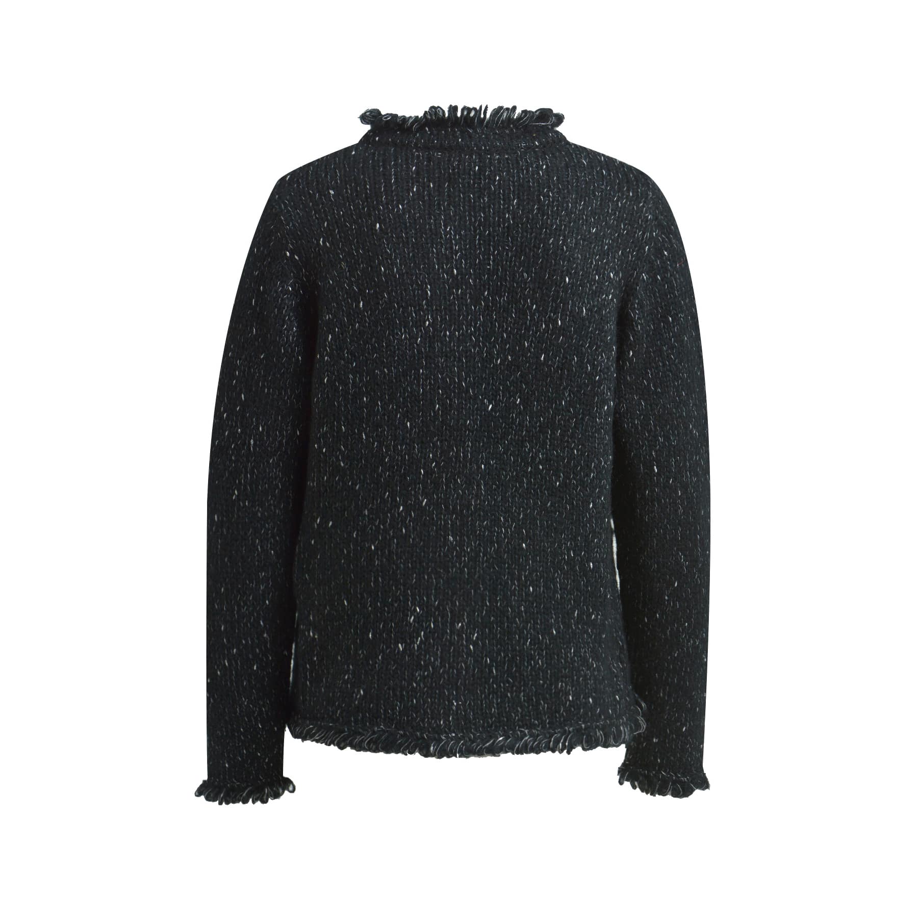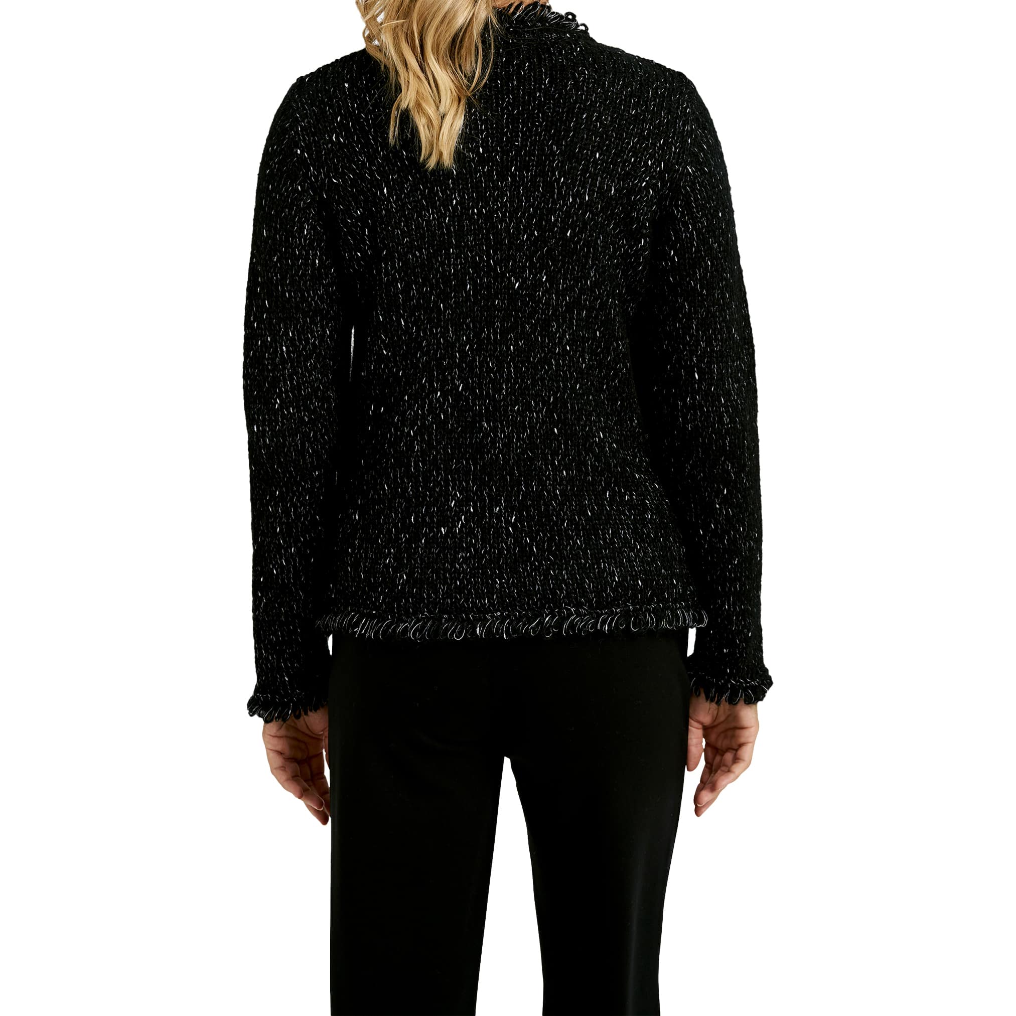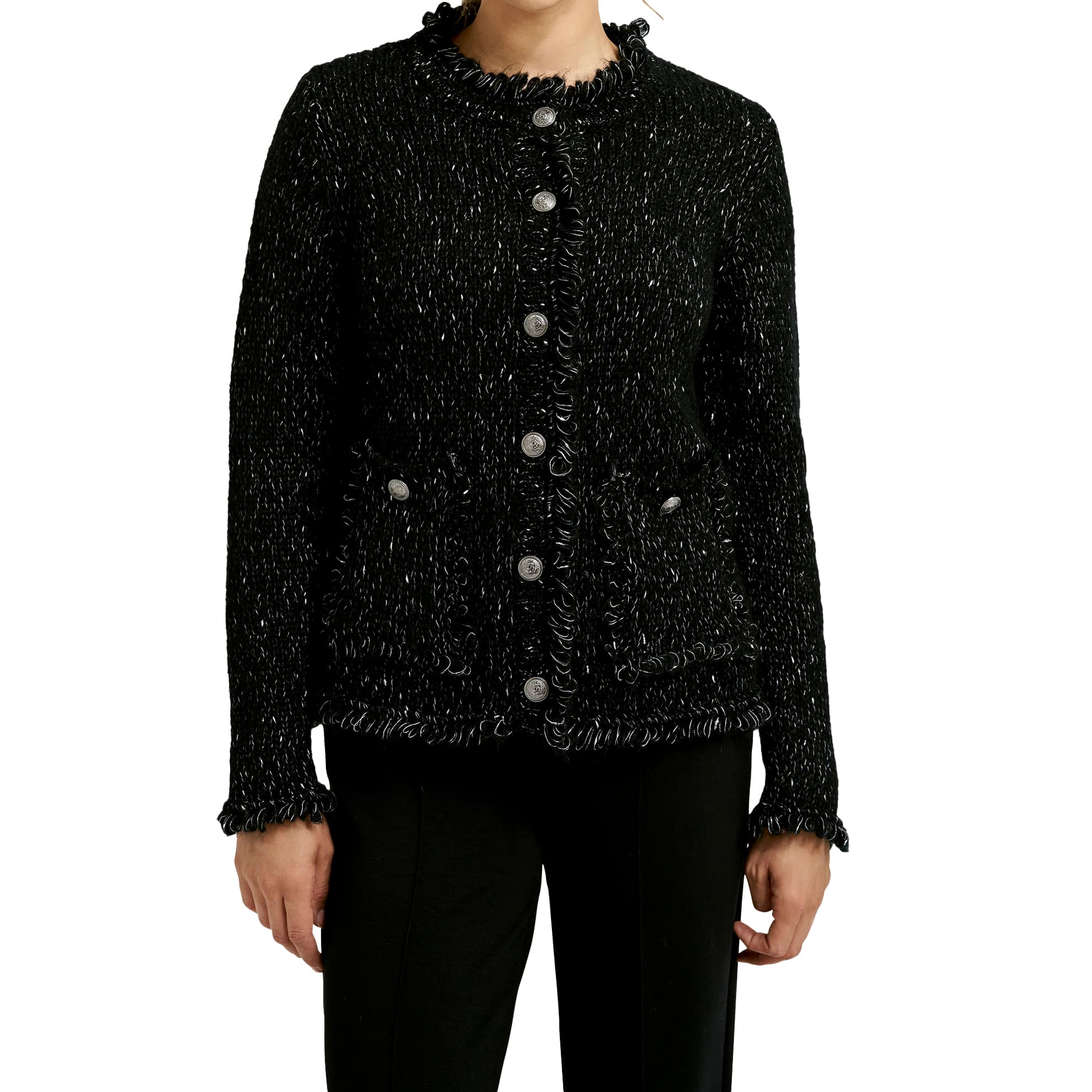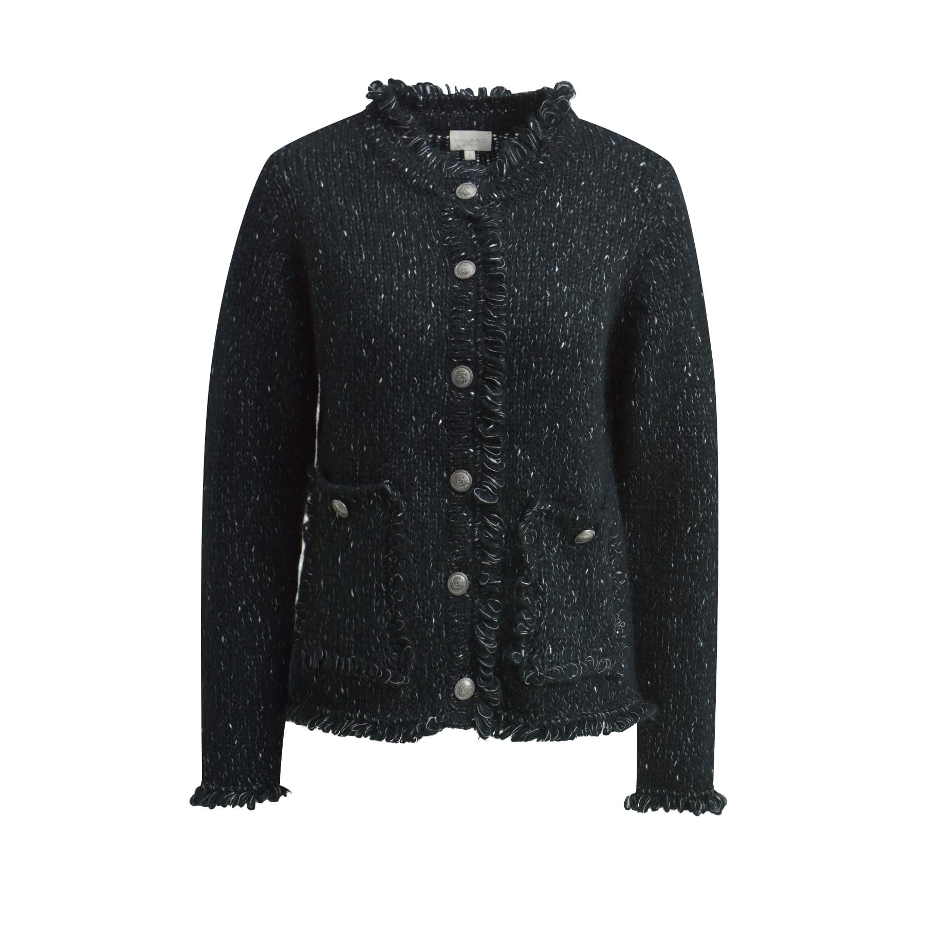 Zwarte cardigan van Milano Italy. Dit vest is gebreid in een zwart met zilveren draad en gemaakt van een mix met mohair. Het vest sluit aan de voorzijde met knopen, heeft twee steekzakjes en een normale pasvorm.