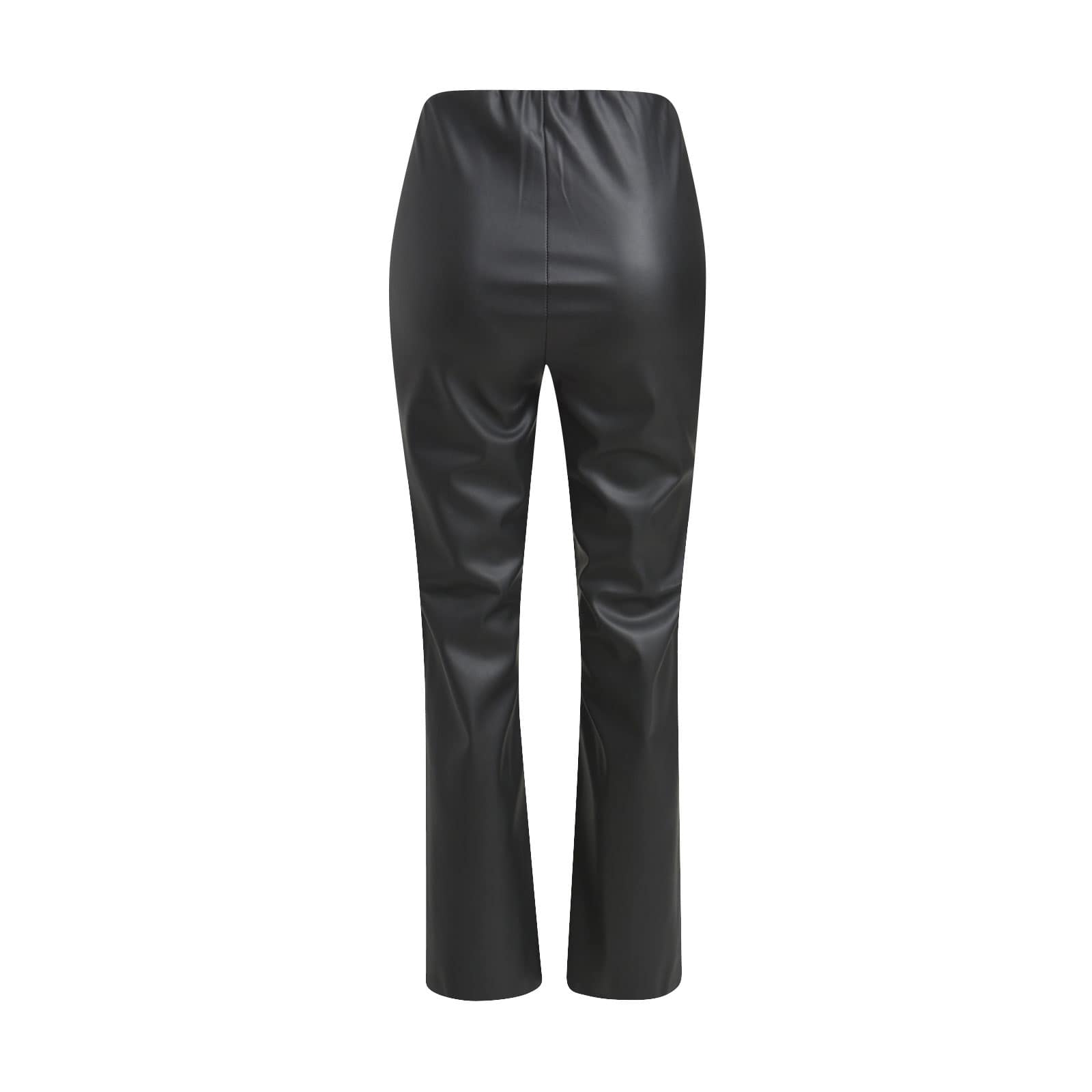 Zwarte pantalon van Milano Italy. Deze pantalon is gemaakt van een leerlook stof en heeft licht uitlopende broekspijpen met een kleine bootcut. De broek heeft een elastische tailleband.