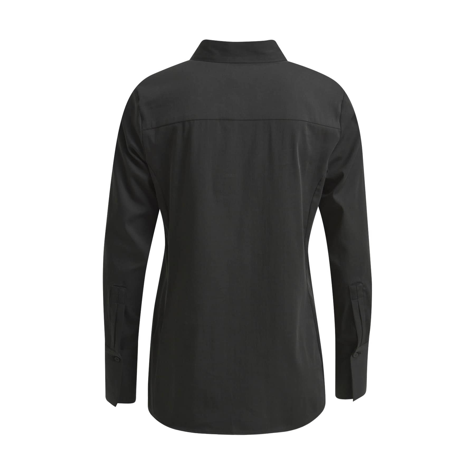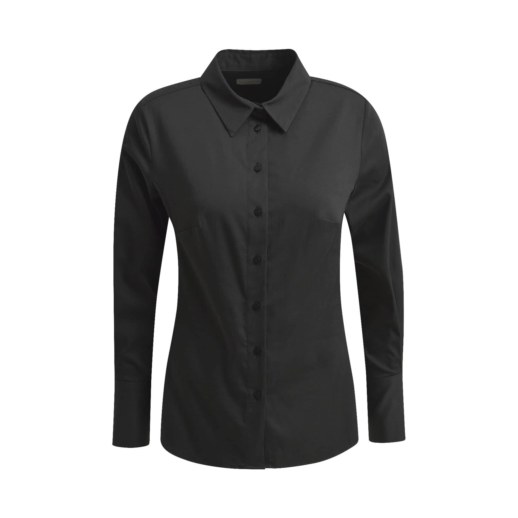 Zwarte blouse van Milano Italy. Deze blouse is gemaakt van een zwarte katoenen stretch stof en heeft een getailleerde pasvorm. De blouse sluit met knoopjes, heeft een klassieke kraag en heeft lange mouwen.