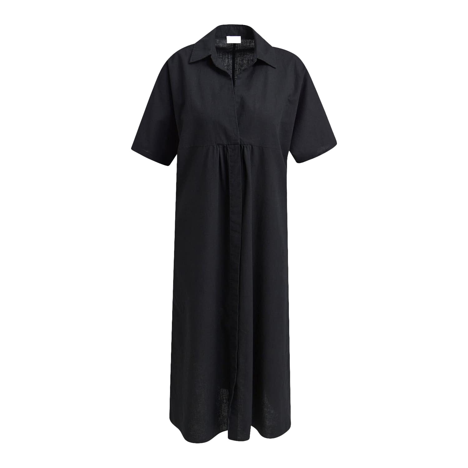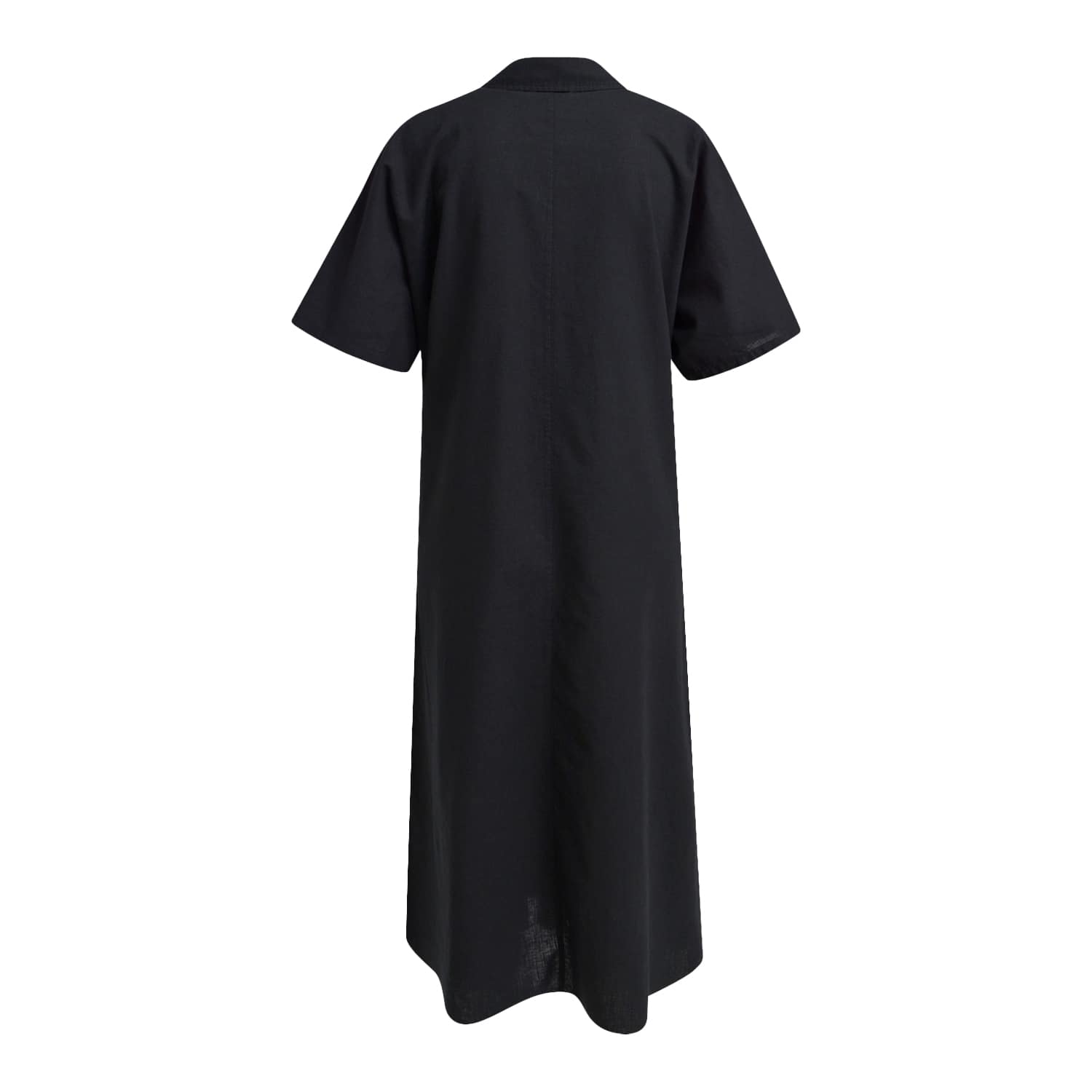 Zwart kleedje van Milano Italy. Deze midi jurk is gemaakt van een linnen mix met katoen en sluit aan de voorzijde met een knoopsluiting. De jurk heeft korte mouwen, V-hals, twee steekzakken, uitlopende rok met aan beide kanten een split en een losse relaxte pasvorm.