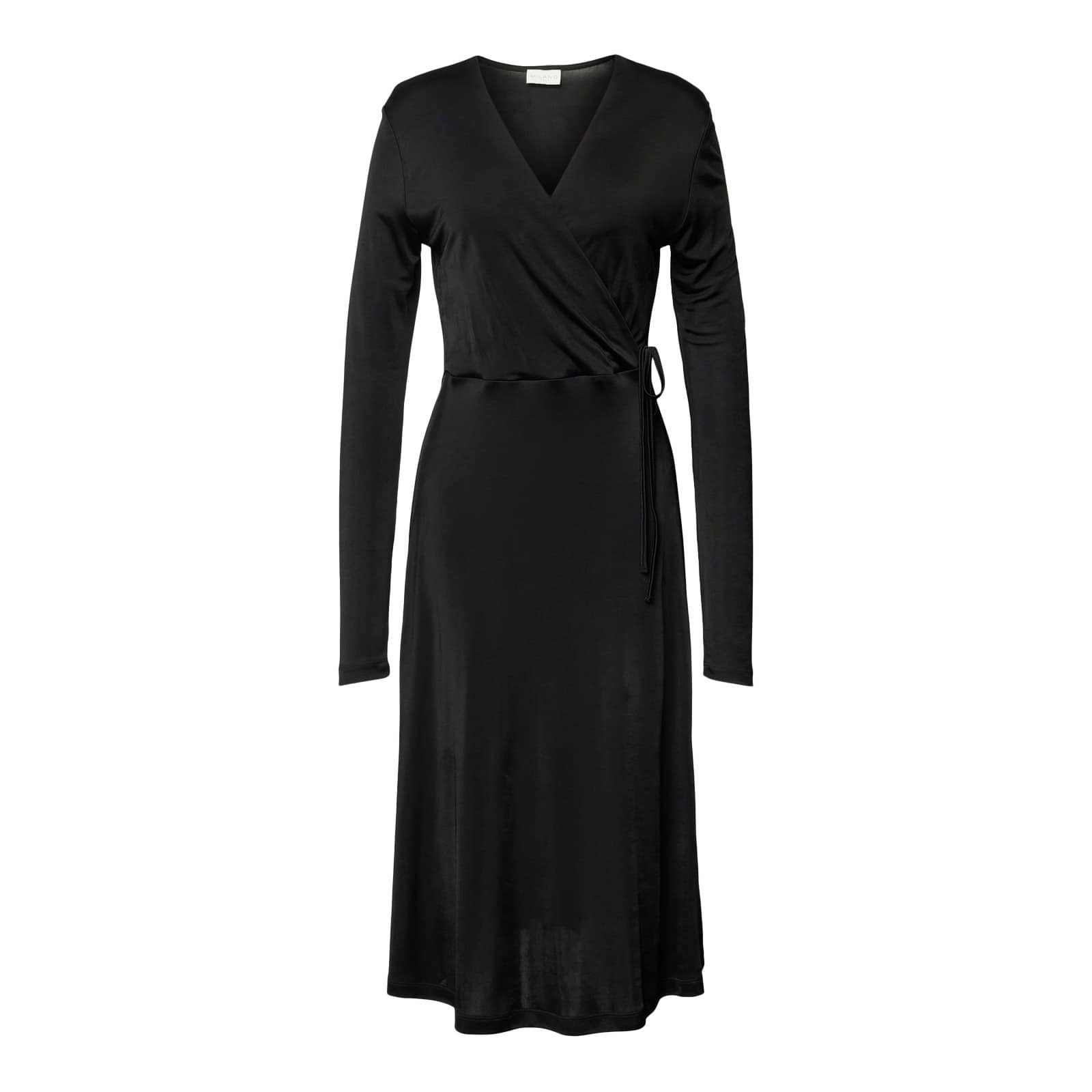 Zwart midi kleedje van Milano Italy. Deze jurk is gemaakt van een dunne, gladde, zwarte stretch stof heeft een overslag look en valt onder de knie. De jurk heeft een vaste overslag, decoratieve koordjes aan de zijkant en lange mouwen.