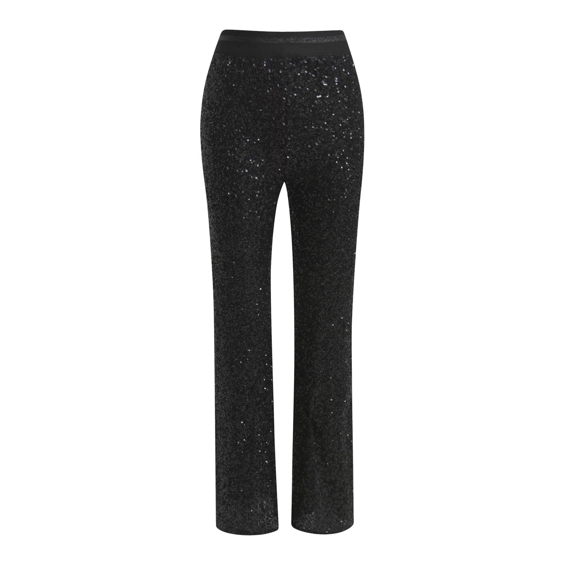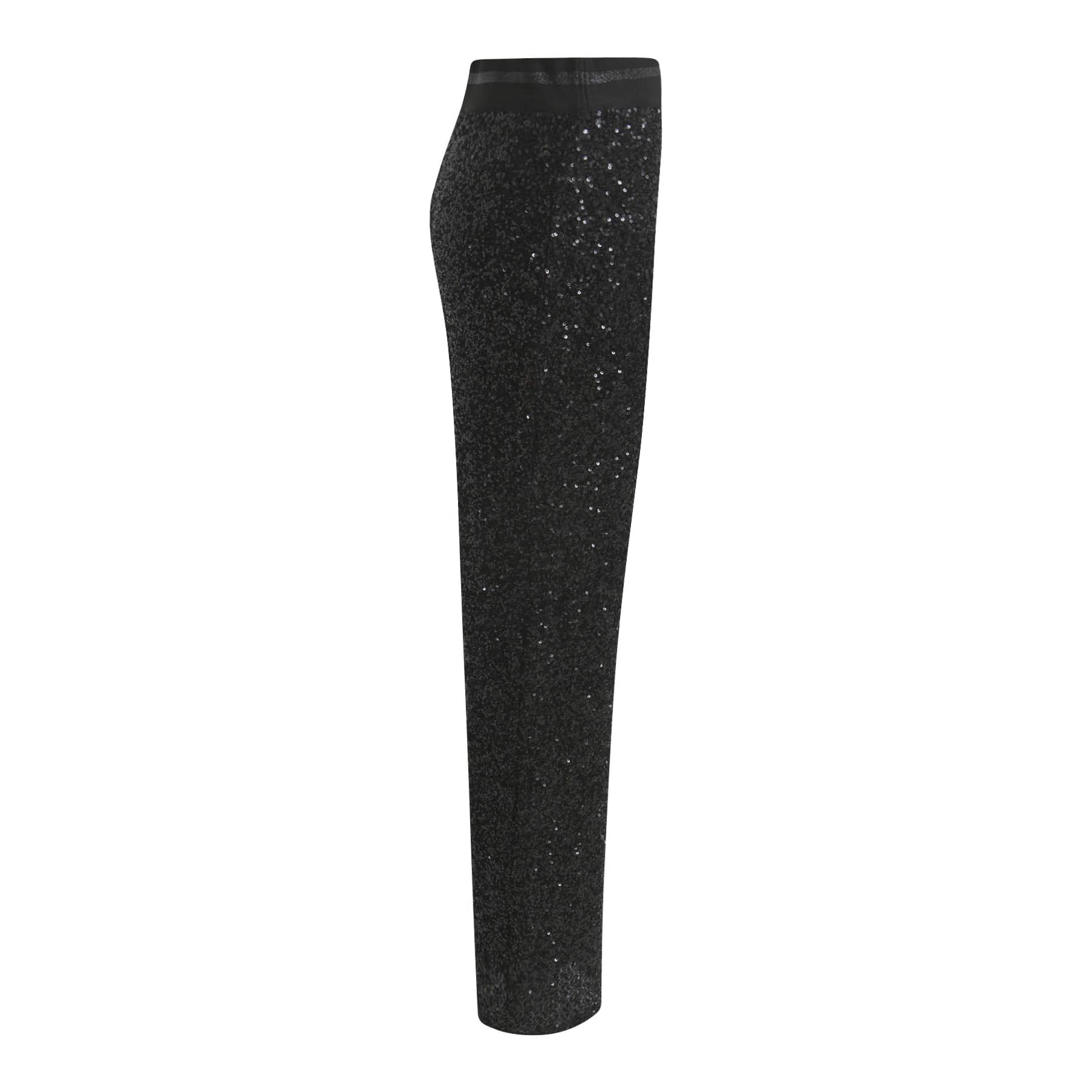 Zwarte pailletten pantalon van Milano Italy. Deze broek is gevoerd, gemaakt van een zwarte stretch stof die overal bedekt is met zwarte pailletten en heeft wijde, rechte broekspijpen. De pantalon heeft een elastische taille en valt lang.