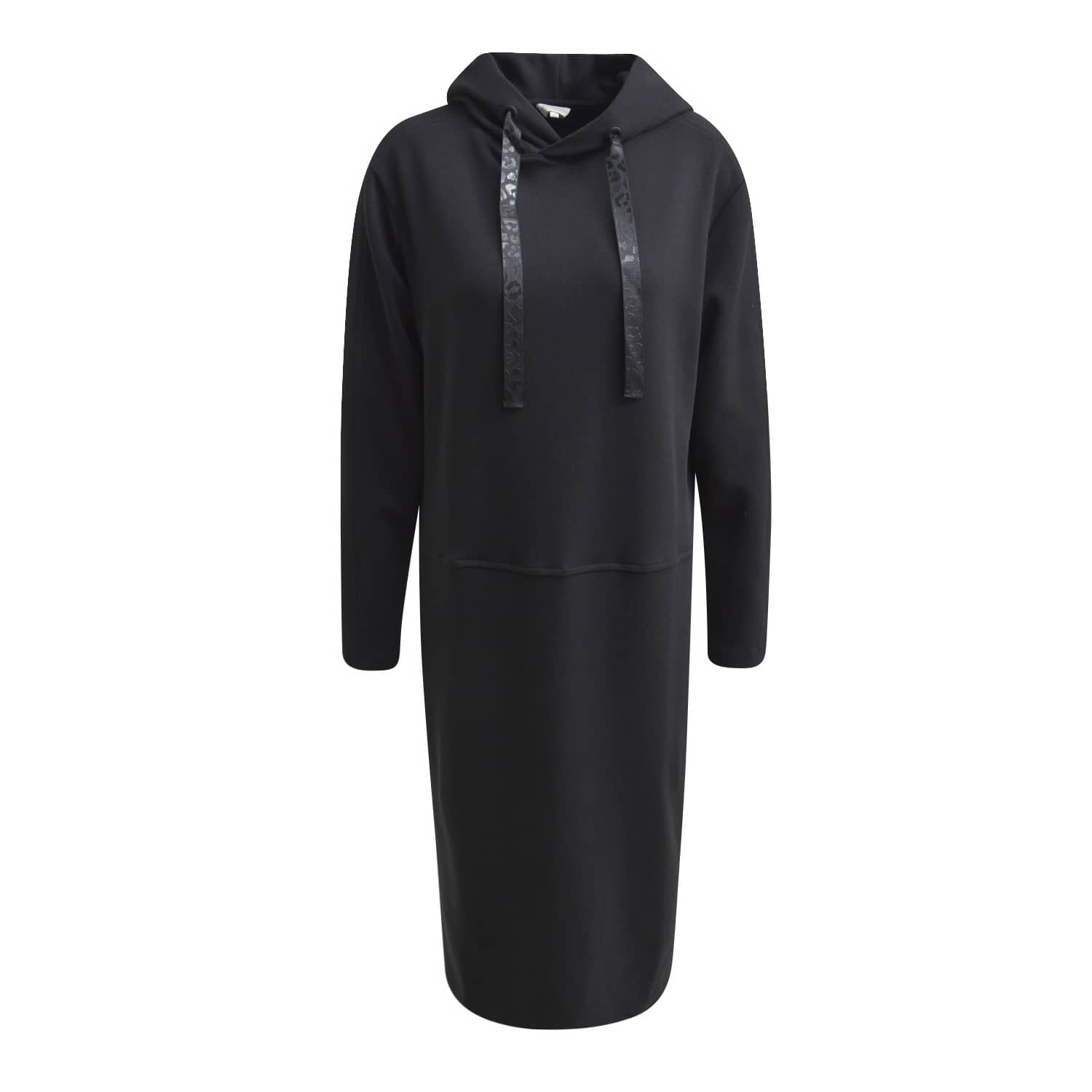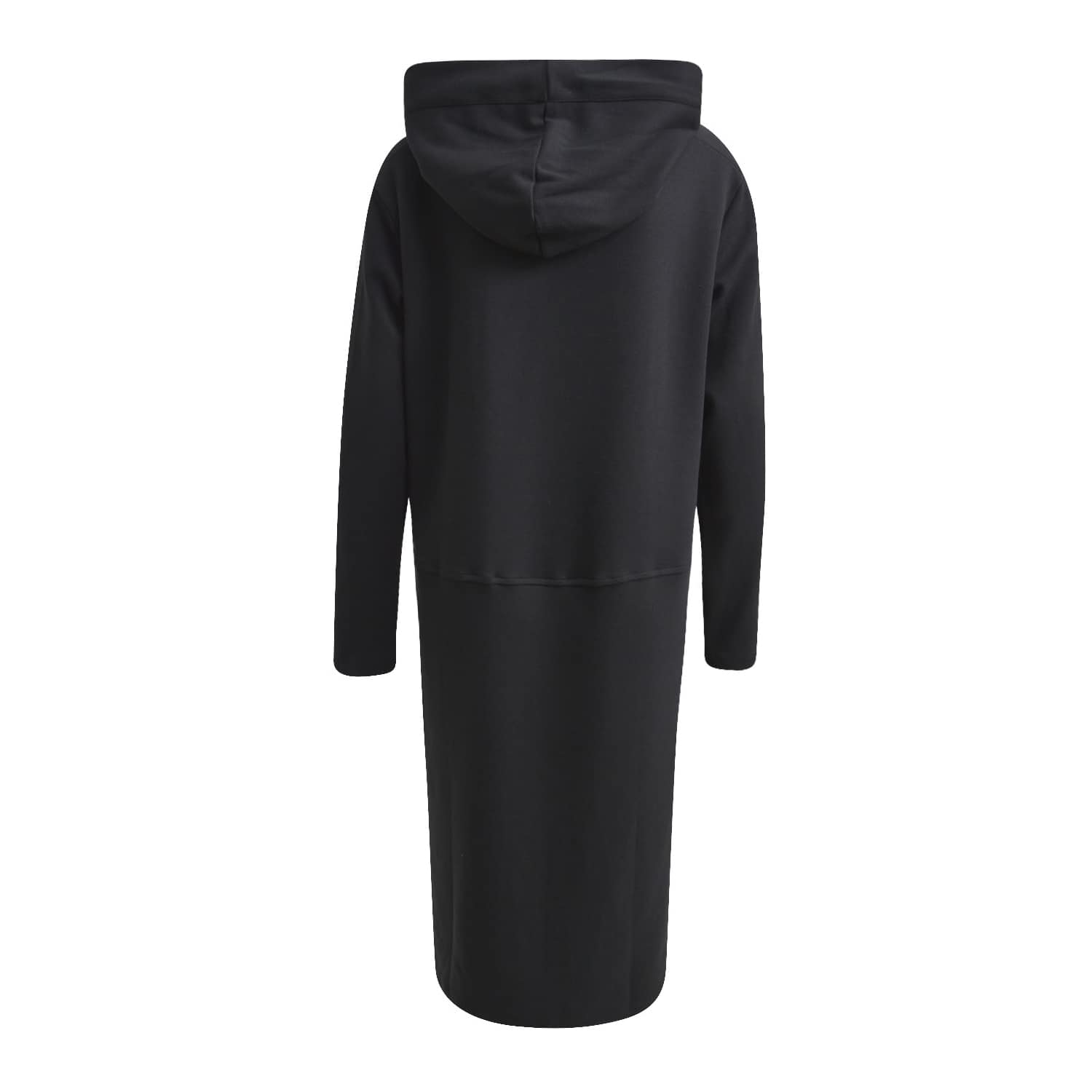 Los vallend zwart kleedje van Milano Italy. Deze zwarte jurk is gemaakt van sweat stof, heeft een rechte, zeer ruime pasvorm en twee steekzakken. De jurk valt net onder de knie, heeft lange mouwen en een vaste capuchon met treklint.
