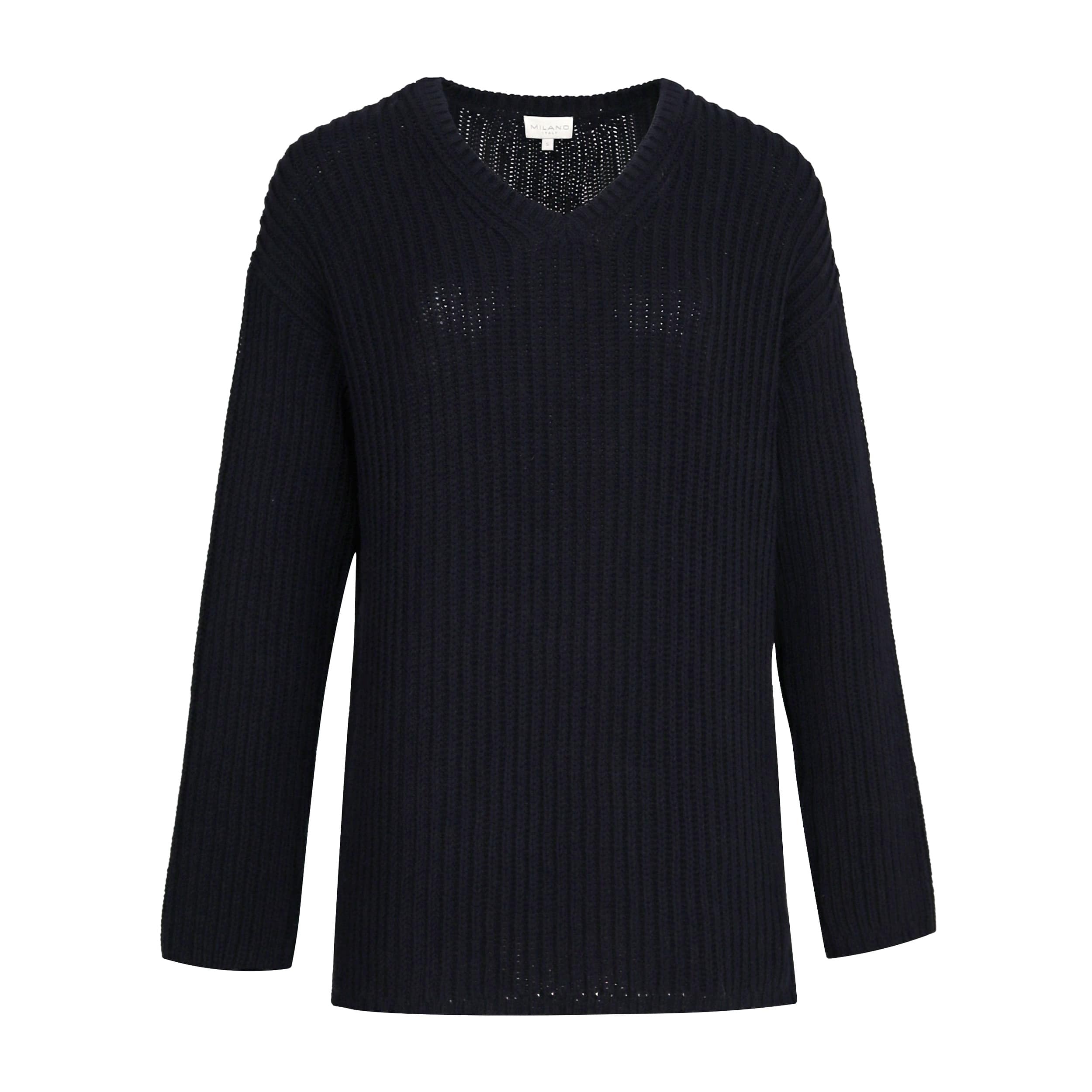 Zwarte trui van Milano Italy. Deze gebreide trui is gemaakt van een katoen mix en heeft een ruime, losse pasvorm. De trui heeft lange mouwen, een V-hals en geribbelde hals, zoom en manchetten.