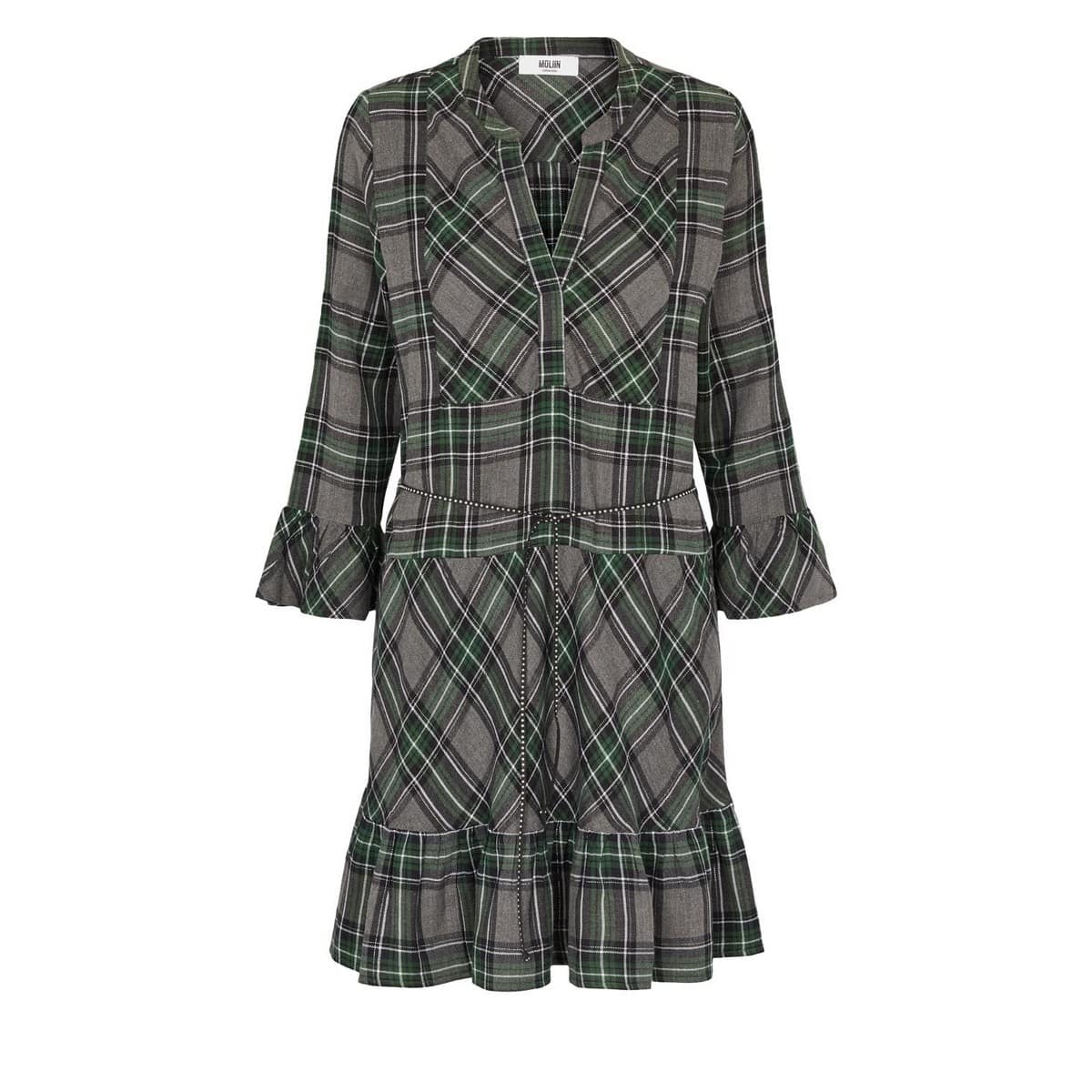 Geruit kleedje van Moliin, model Romy. Deze grijze jurk heeft lange mouwen, een zwierige rok en halsinsnede. De jurk is gemaakt van een grijze stof met hierop een donkergrijze met groene ruit. Als accessoire heeft deze jurk een dun zwart lint met zilveren studs.