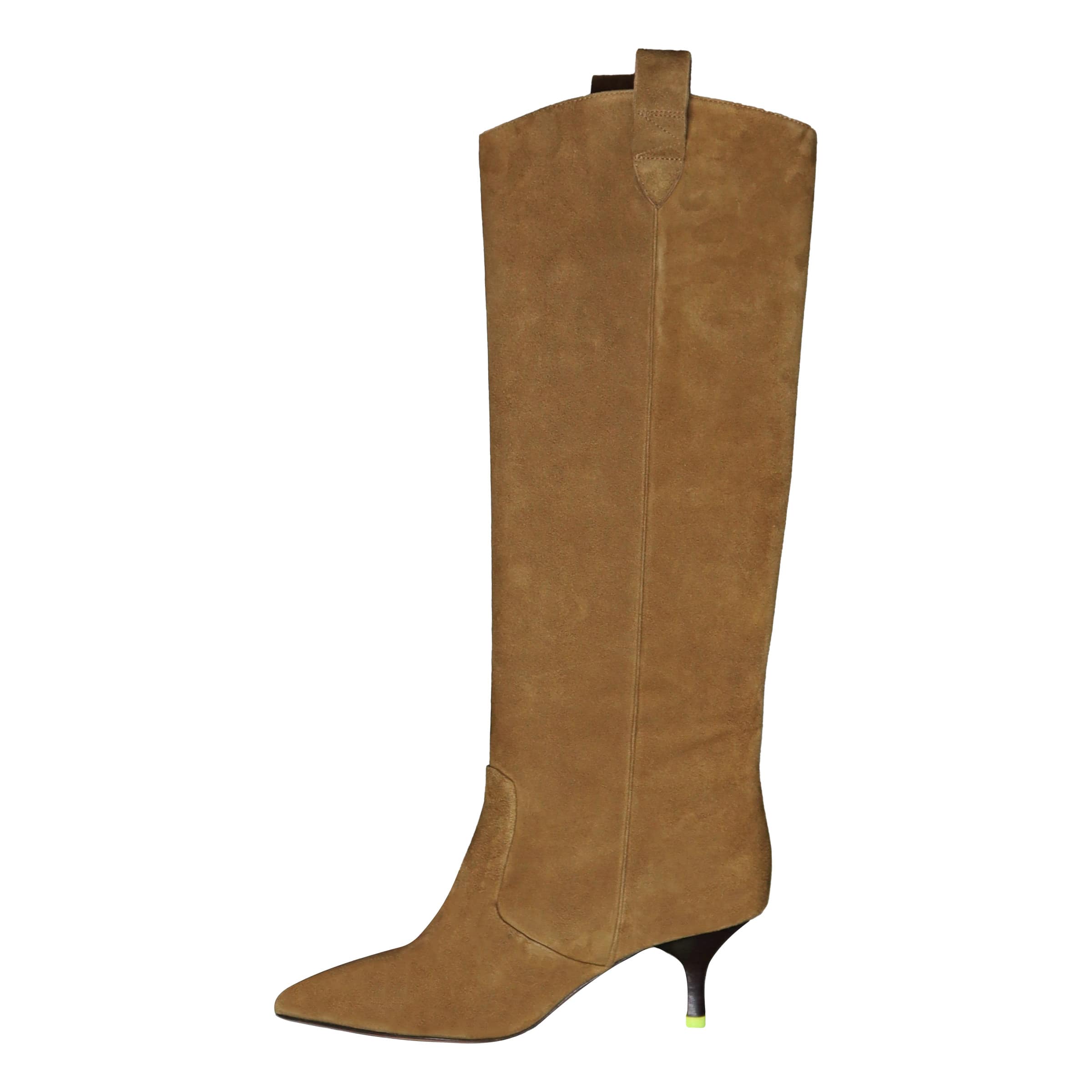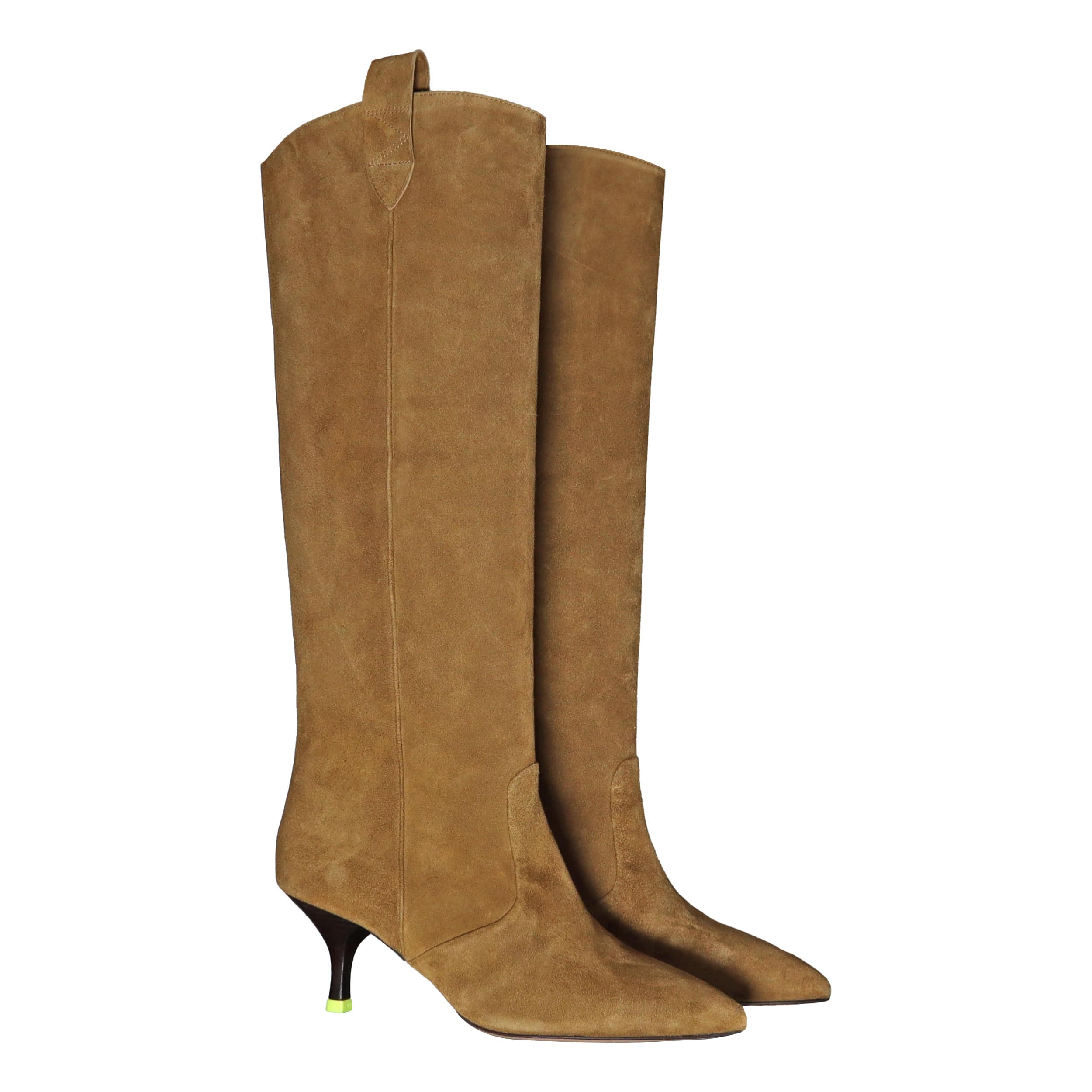 Bruine suède laarzen van Morobé, model Rosalie in whiskey cognac. Deze laarzen zijn gemaakt van bruin suède en hebben een schacht van 39 cm.. De laarzen hebben een kitten heel van 6 cm..