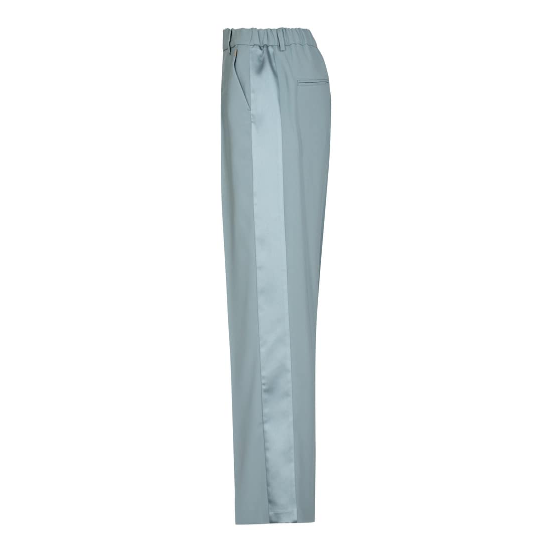 Relaxte pantalon van Mos Mosh, model Bai Leia Satin pant in lead. Deze blauw grijze broek heeft aan beide zijden een satijnen bies en een elastische taille. De pantalon heeft aan de voorzijde twee steekzakken, aan de achterzijde twee sier paspelzakken en valt tot op de enkels.