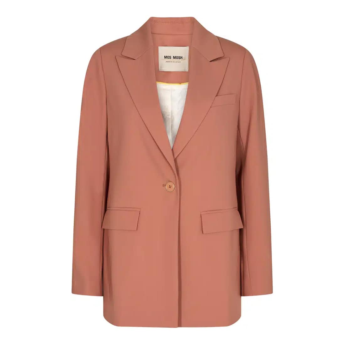 Bruine blazer van Mos Mosh, model Bine Leia Blazer in pecan brown. Deze blazer heeft een losvallende, rechte pasvorm en sluit met een knoop aan de voorzijde. De blazer heeft twee klepzakken en een sier borstzakje aan de voorzijde en een splitje aan de achterzijde.