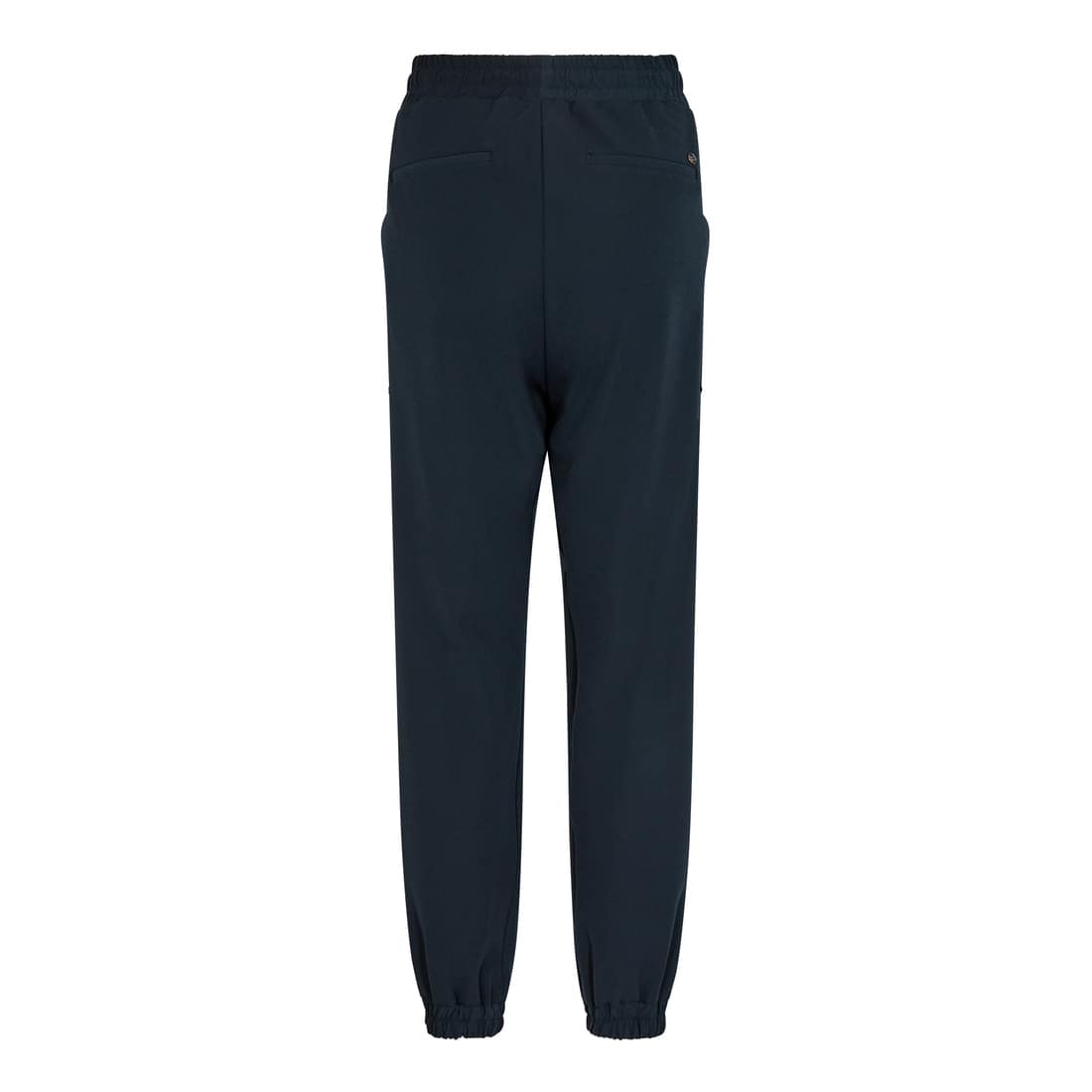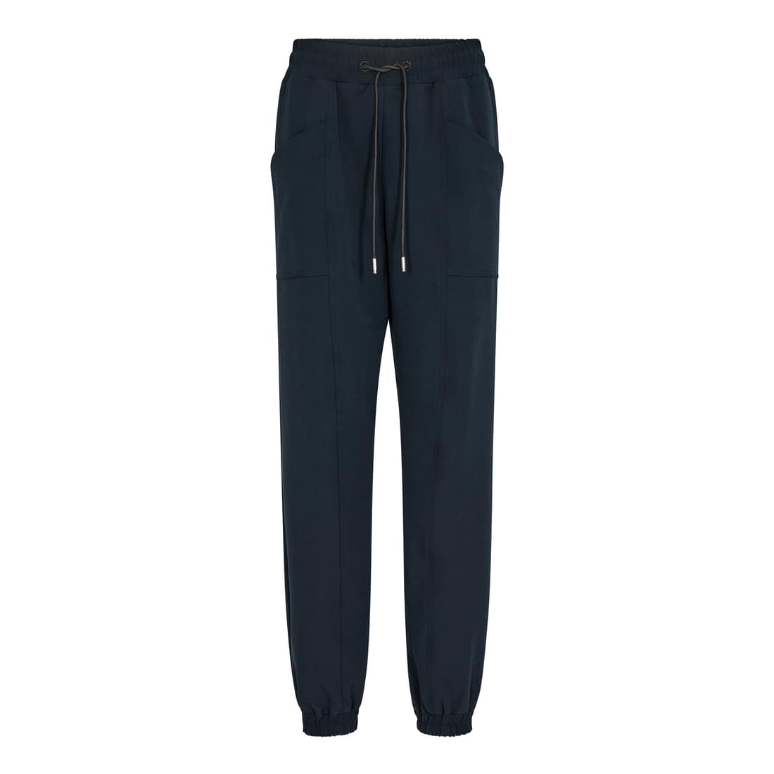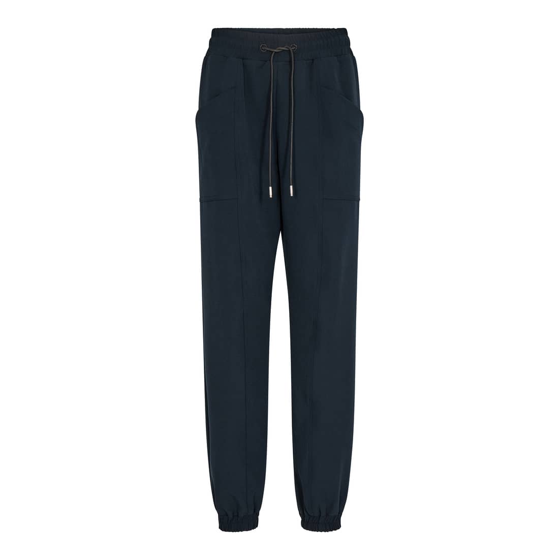Relaxte pantalon van Mos Mosh, model Anai Davina pant in salute navy. Deze donkerblauw broek heeft een los vallende pasvorm met een hoge elastische taille met trekkoord. De pantalon heeft aan de voorzijde twee steekzakken, aan de achterzijde twee sier paspelzakken en valt tot op de enkels.