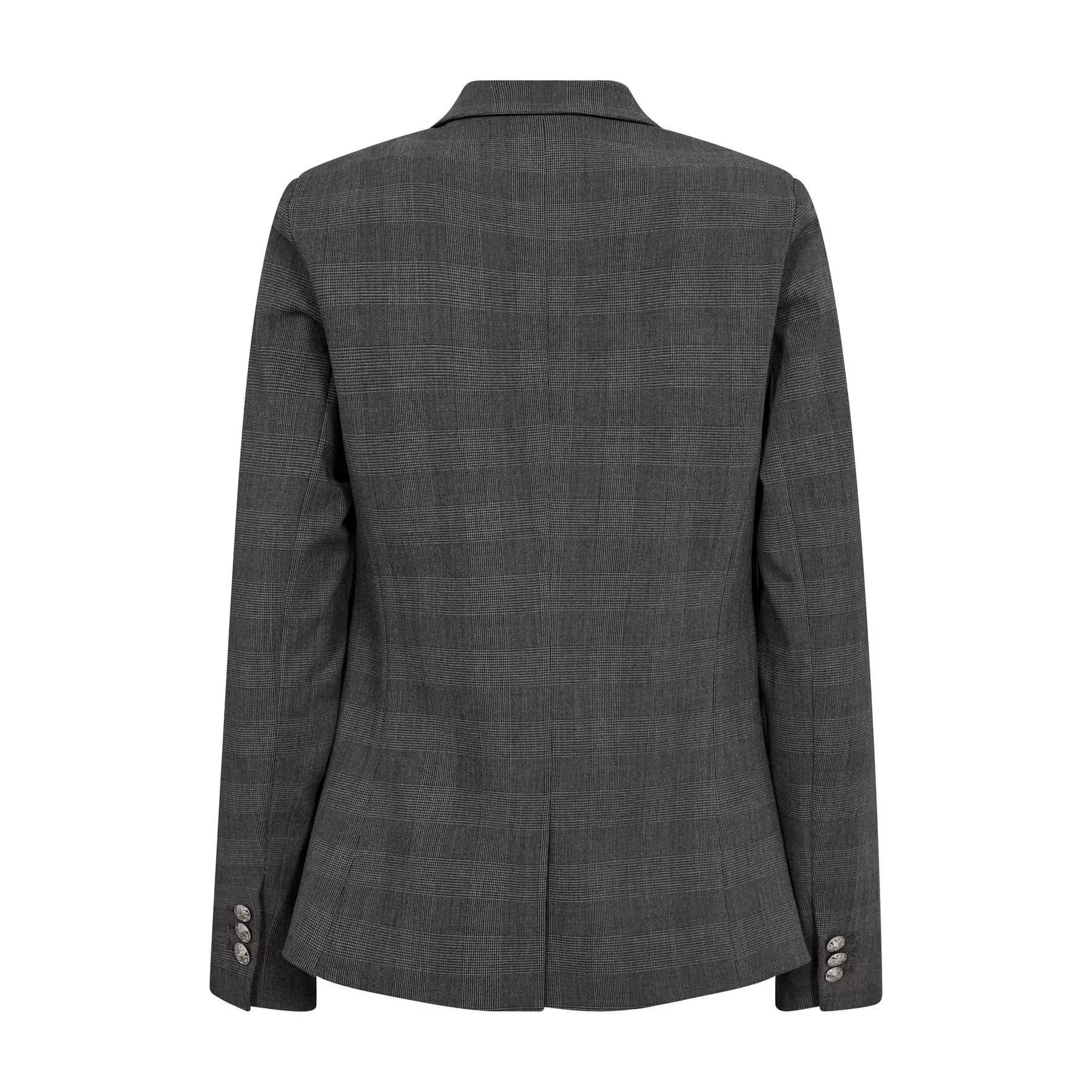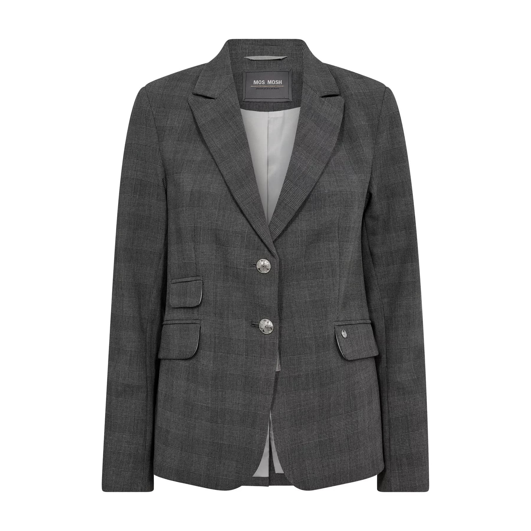 Grijze blazer van Mos Mosh, model Blake Kimi in sharkskin. Deze blazer heeft een slim fit pasvorm en sluit met twee knopen aan de voorzijde. De blazer heeft twee klepzakken en een sier klepzak aan de voorzijde en een splitje aan de achterzijde. De knoopsluiting heeft een decoratieve strook grijze stof.