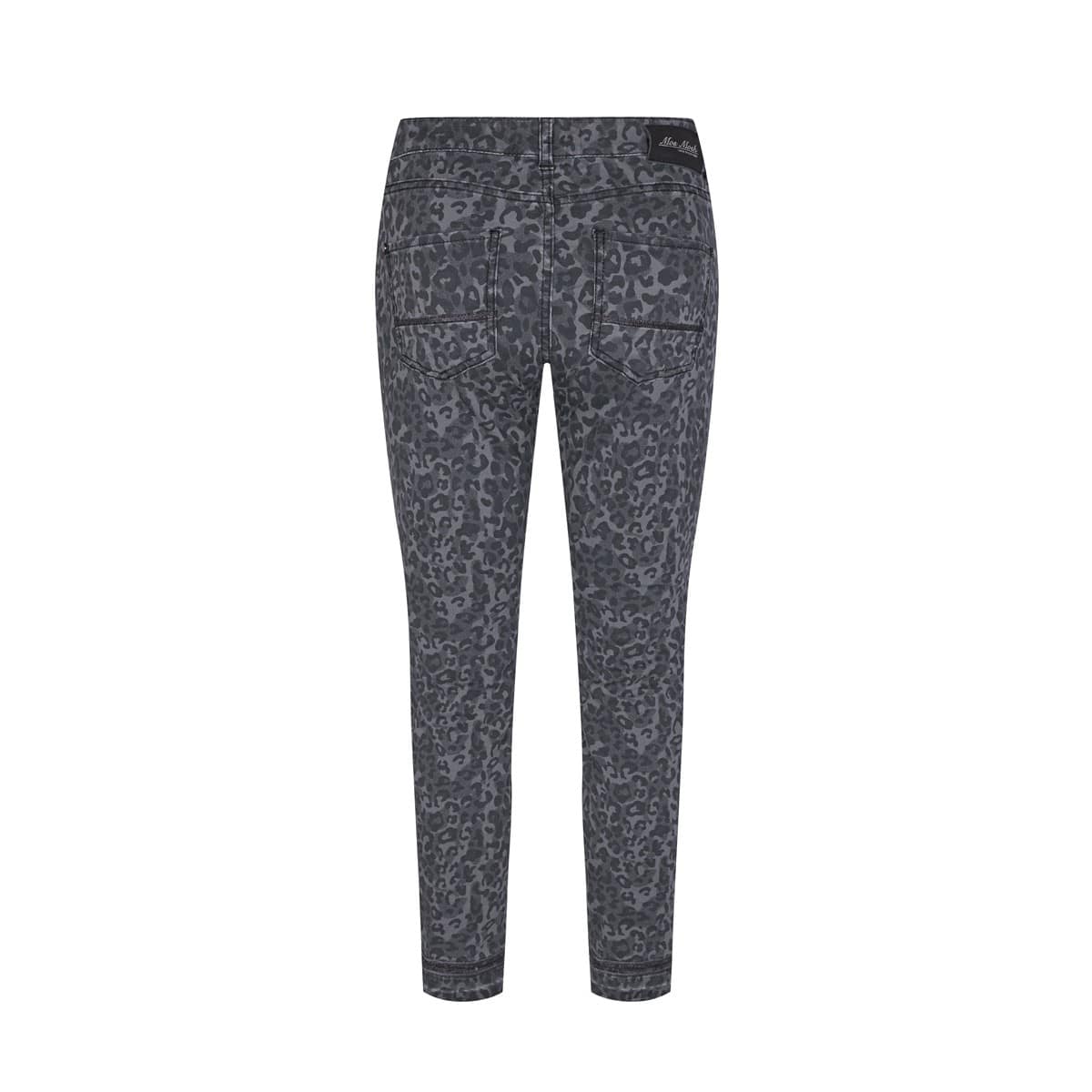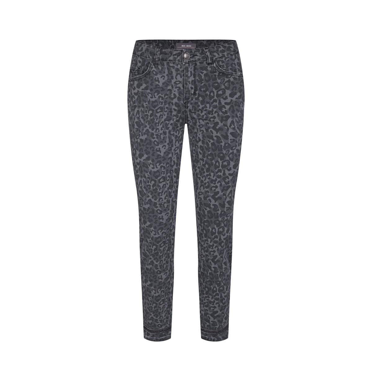 Slim fit jeans van Mos Mosh, model Sumner Shannon pant in wet weather. Deze grijs denim broek heeft een all over luipaard print, een normale taille en onafgewerkte zoom met licht rafels. De jeans sluit met knoop- en ritssluiting, valt net boven de enkels en heeft twee steekzakken en twee achterzakken.