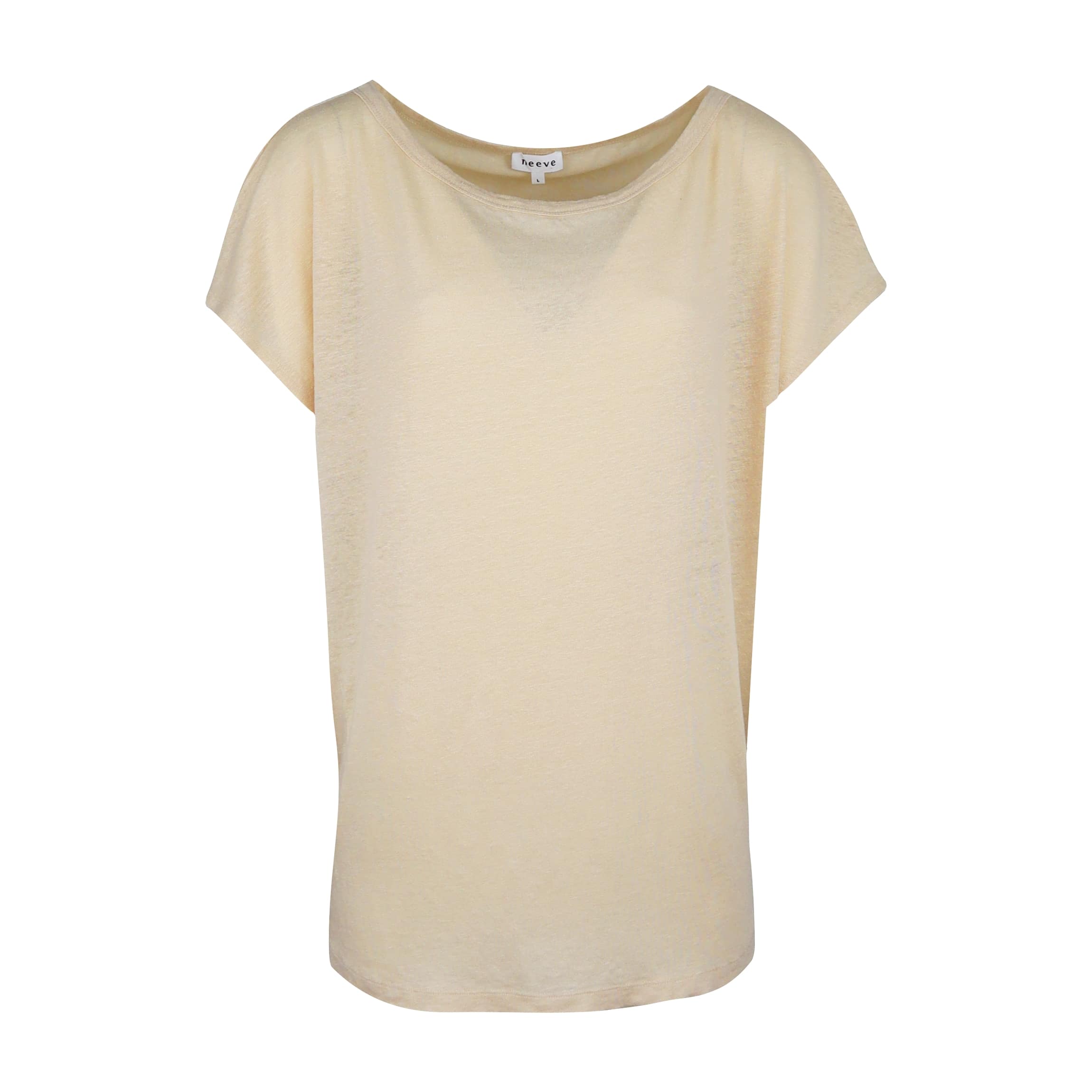 Beige t-shirt van Neeve, model The Noa. Dit shirt is gemaakt van 100% linnen. Het shirt heeft een klassieke pasvorm met een brede boothals en korte vleermuismouwen. Je kunt dit t-shirt dragen met een open schouder of met een mooie brede hals.