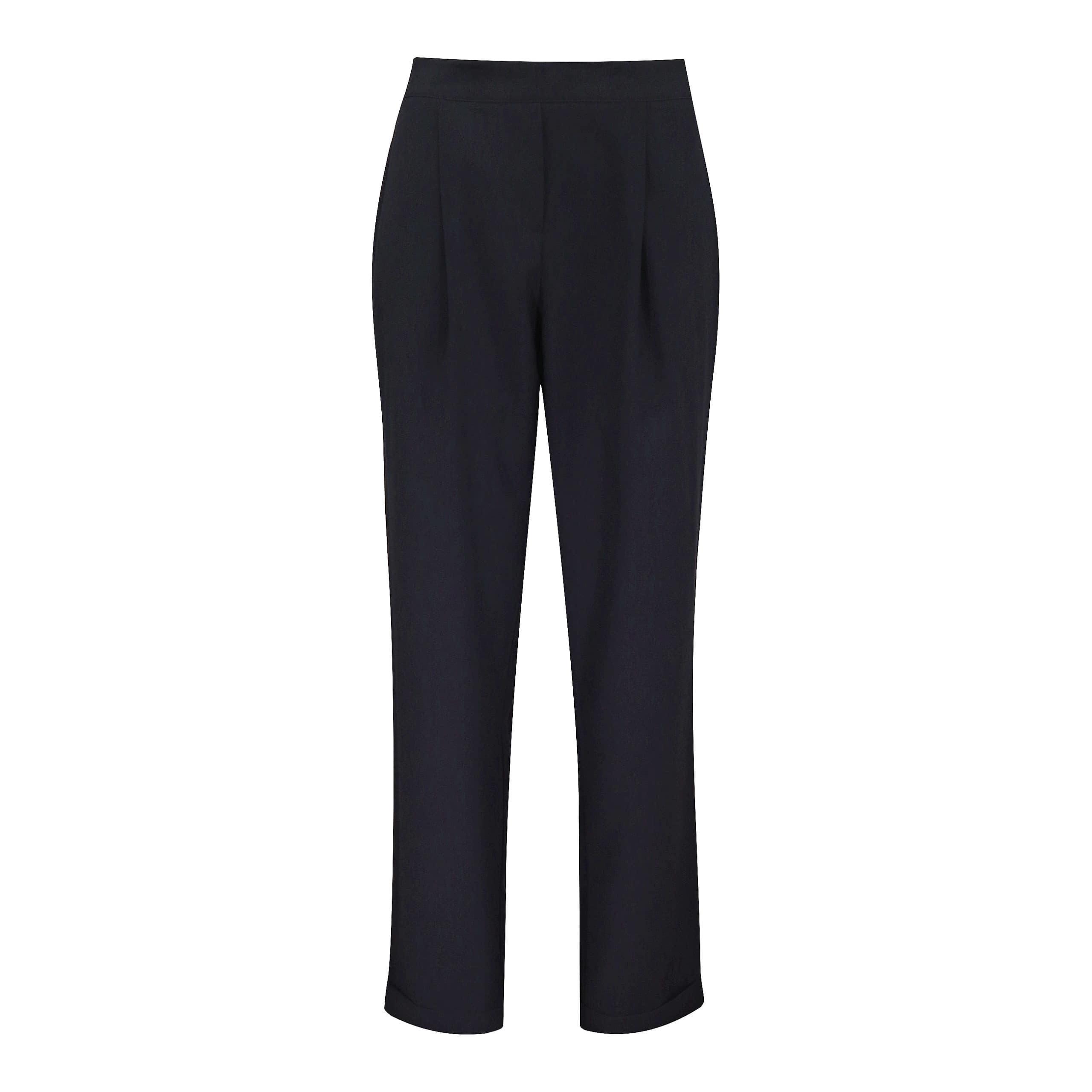 Zwarte pantalon van Nenette, model pantaloni Egeo confezione New York in nero. Deze pantalon heeft toelopende broekspijpen die op de enkels valt en een hoge taille. De broek heeft een geplooide elastische taille, twee steekzakken en twee sier paspelzakken aan de achterzijde.