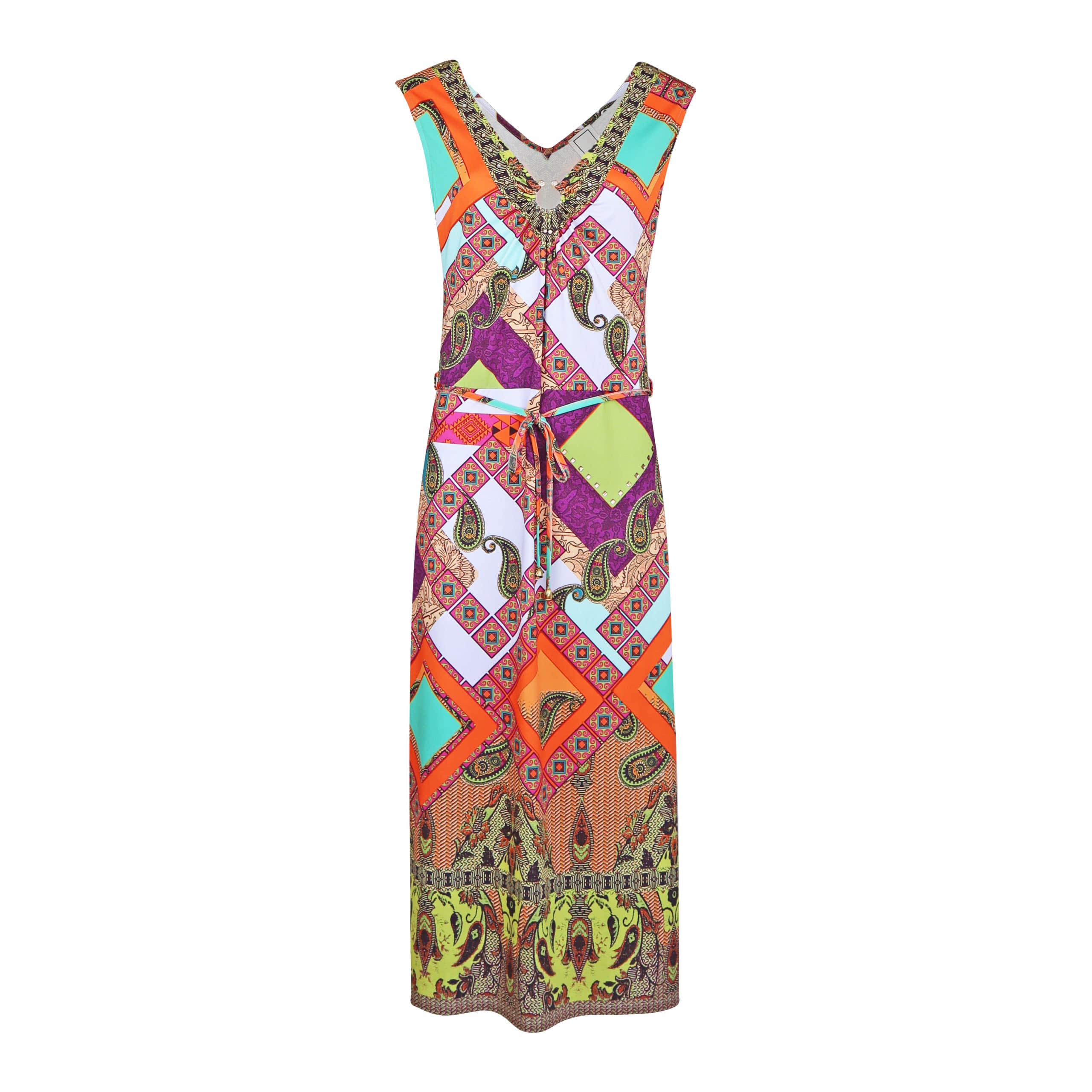 Mouwloos midi kleedje van NSC Studio Los Angeles, model dress Vizcaya. Deze lange jurk is gemaakt van een dunne stretch stof die kleurrijk bedrukt is met een bijpassend koord in de taille. De jurk heeft een rechte pasvorm, is bezet met steentjes aan de hals en op het groene vierkant en heeft een sierlijke decolleté met een metalen decoratie.