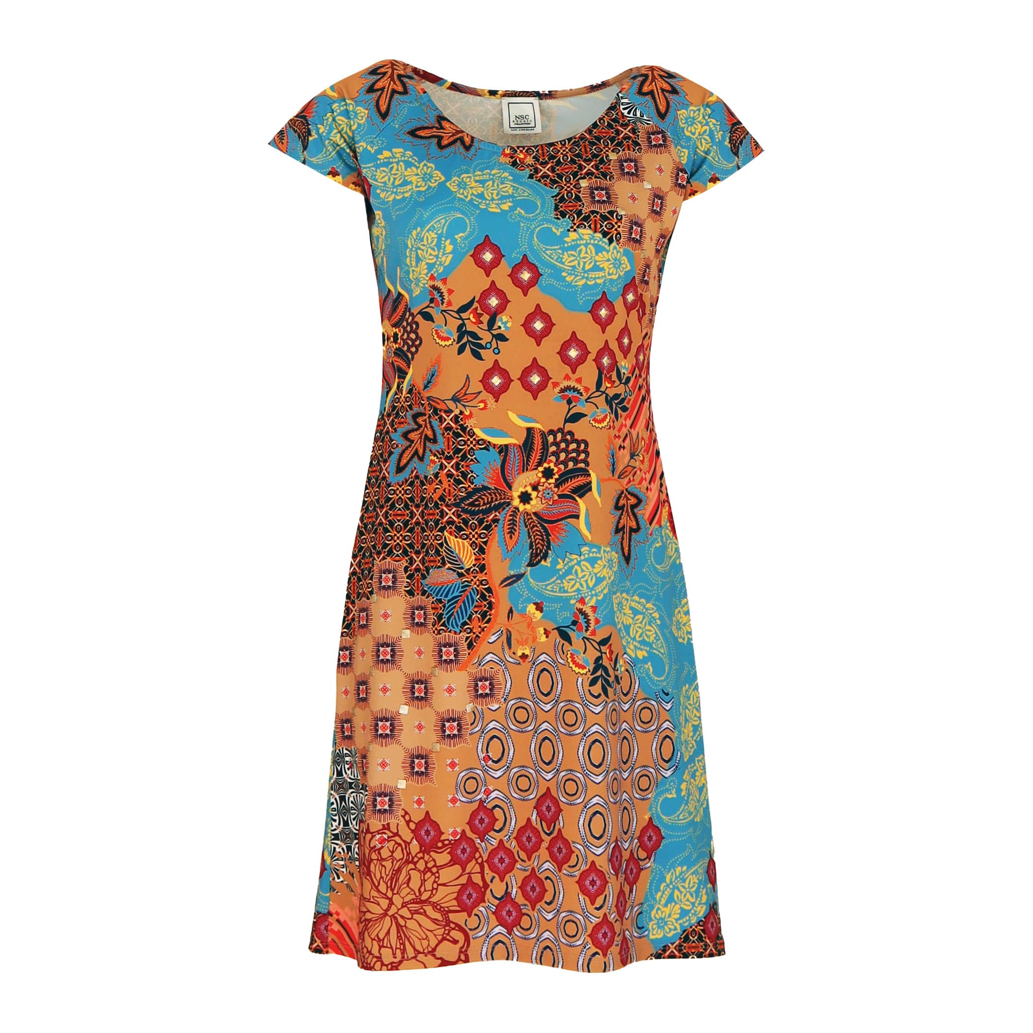 Kort kleedje van NSC Studio Los Angeles, model Sonoma. Deze jurk is gemaakt van een gladde stretch stof die kleurrijk bedrukt is en bezet met kleine zilveren vierkantjes en steentjes. De jurk heeft een ronde hals, korte mouwen en een aansluitende pasvorm.