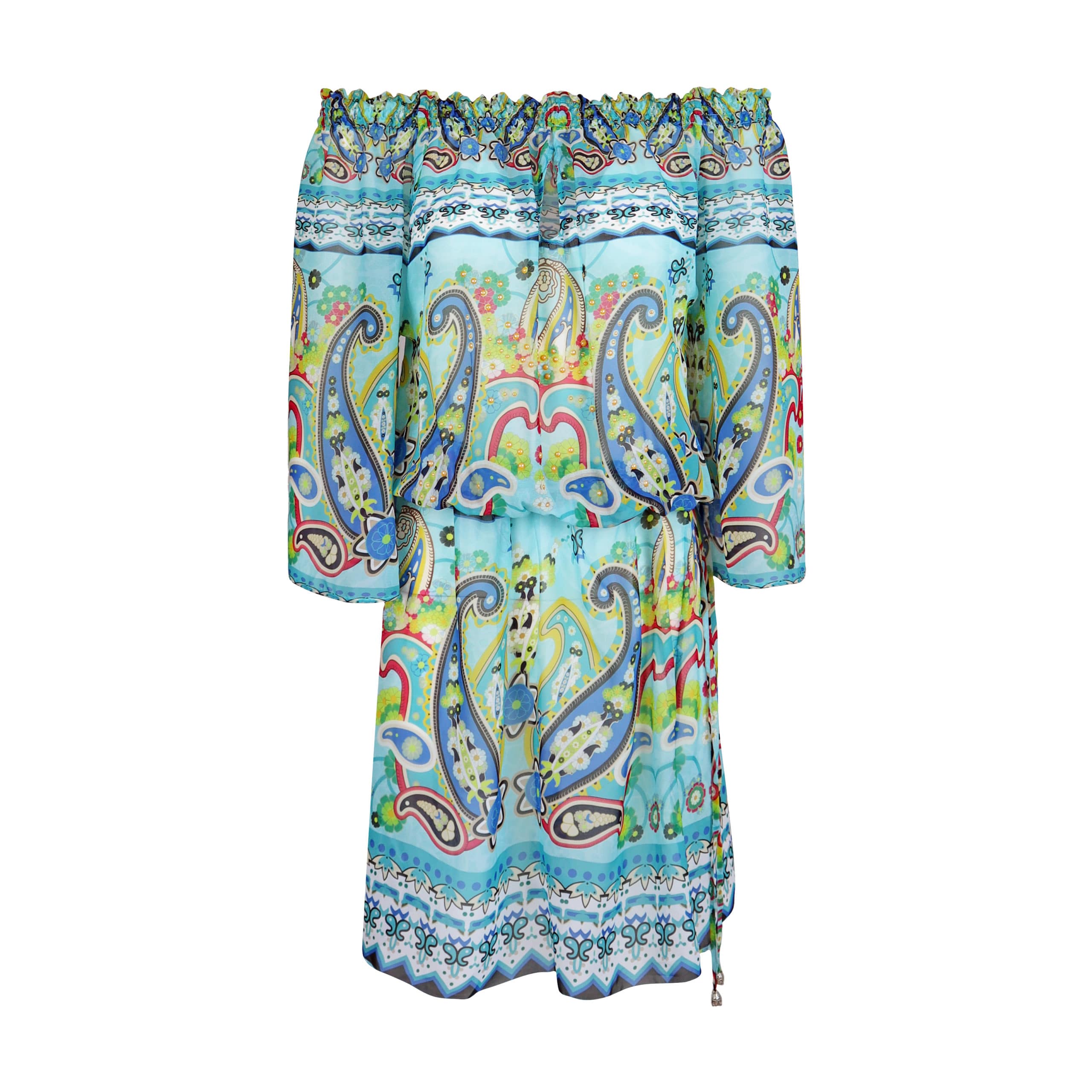 Kort kleedje van NSC Studio Los Angeles, model dress Venice. Deze jurk is gemaakt van een licht doorschijnende dunne stof die kleurrijk bedrukt is met een bijpassend koord in de taille. De jurk heeft een elastische taille en hals, driekwart mouwen en de body is bezet met steentjes. Je kunt de jurk dragen met open schouders of een lange boothals.