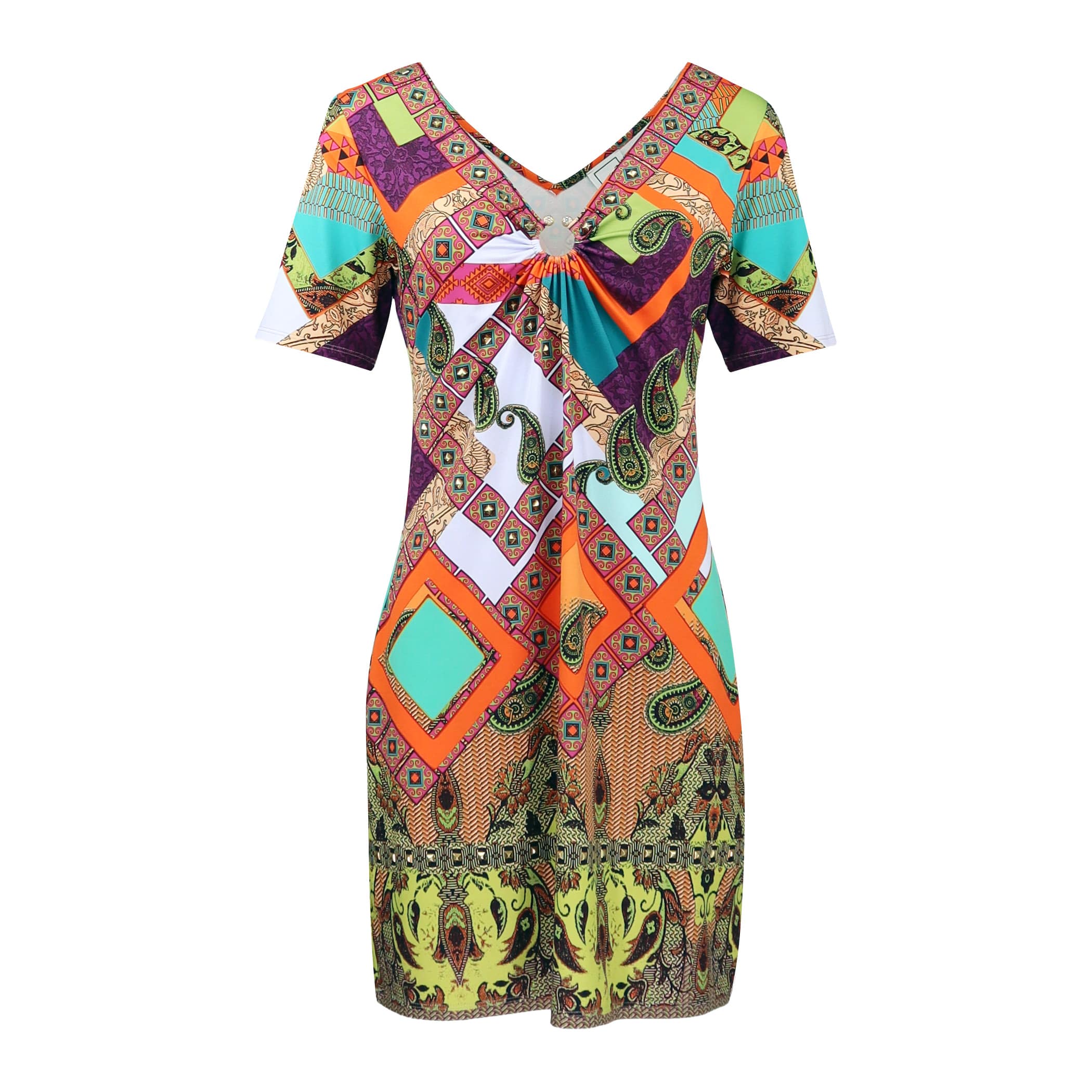 Mini kleedje van NSC Studio Los Angeles, model dress Vizcaya. Deze korte jurk is gemaakt van een dunne stretch stof die kleurrijk bedrukt is en bezet met decoratieve goudkleurige vierkantjes. De jurk heeft een aansluitende pasvorm en een sierlijke decolleté met een metalen decoratie.