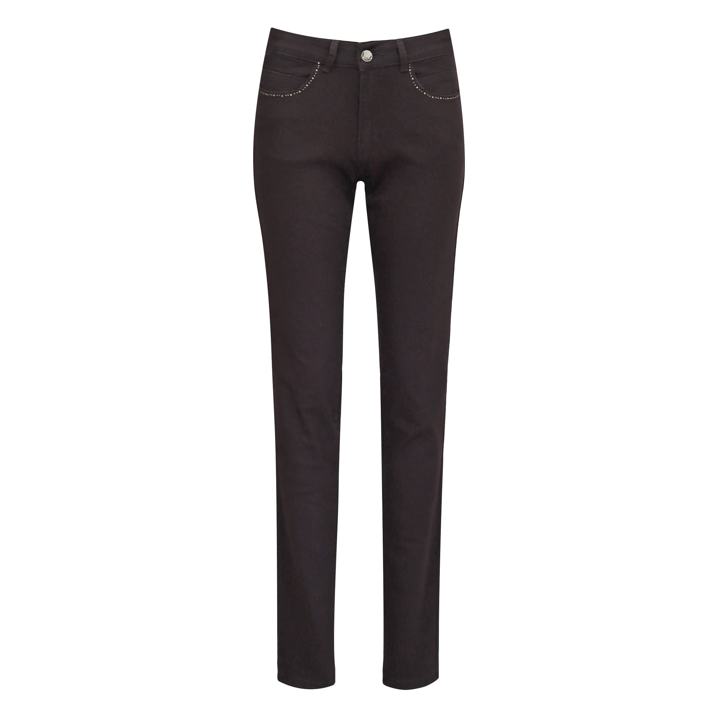 Skinny jeans van Para Mi, model Celine Fancy, high waist, skinny leg in deep brown. Deze donkerbruine denim broek heeft een hoge taille, twee steekzakken, twee achterzakken en sluit met een knoop- en ritssluiting. De jeans is gemaakt van een denim stretch stof en heeft een skinny pasvorm.