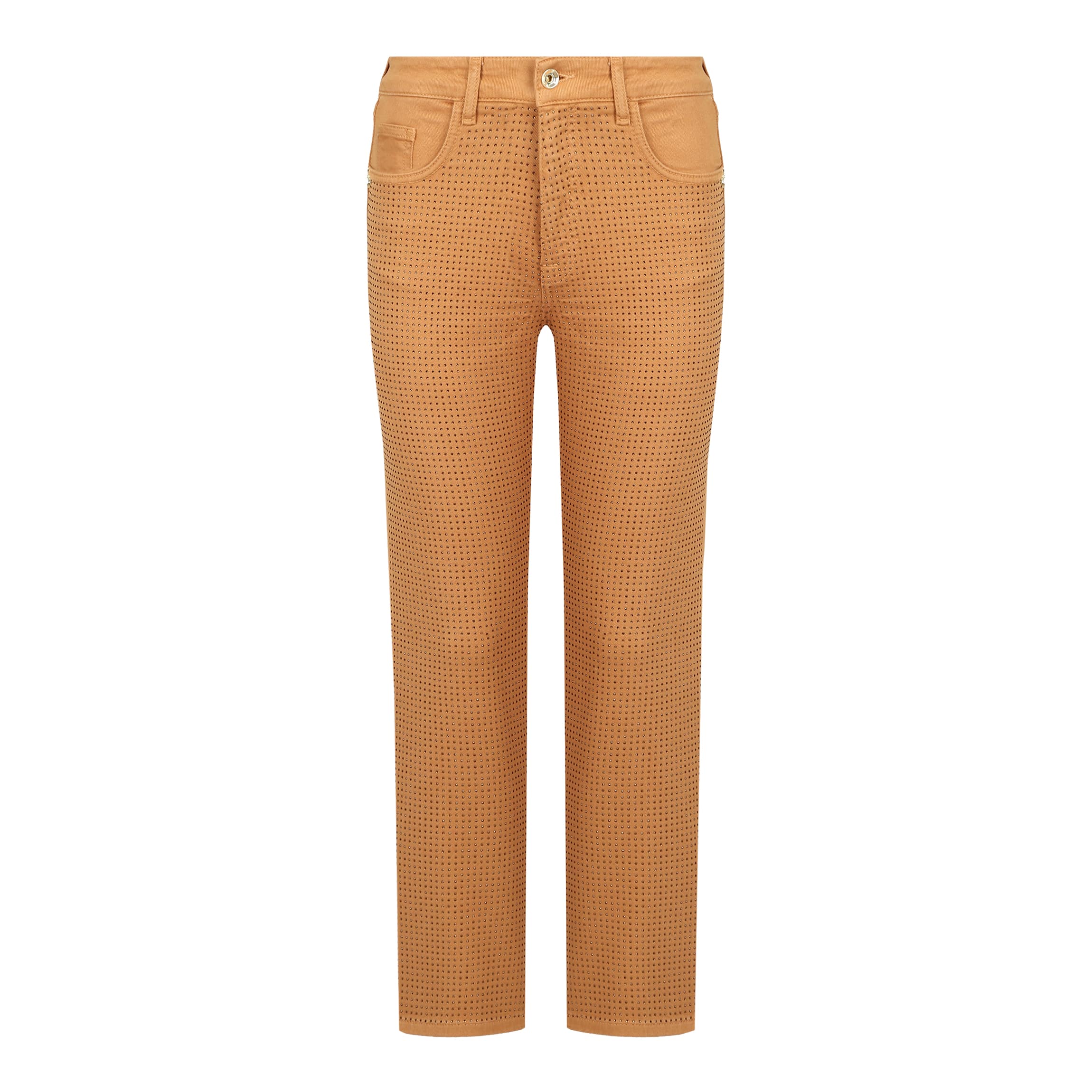 Bruine cropped jeans van Patrizia Pepe in chimpmunk brown. Deze jeans is gemaakt van een denim stretch stof, heeft een rechte pasvorm en valt boven de enkels.  De denim broek sluit met een knoop- en ritssluiting, heeft twee steekzakken en twee achterzakken. De voorzijde van de jeans is geheel bezet met kleine strass steentjes.
