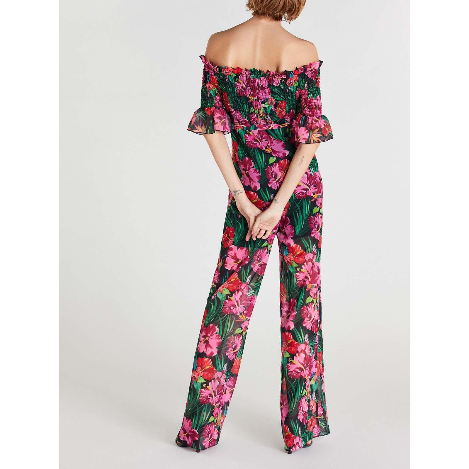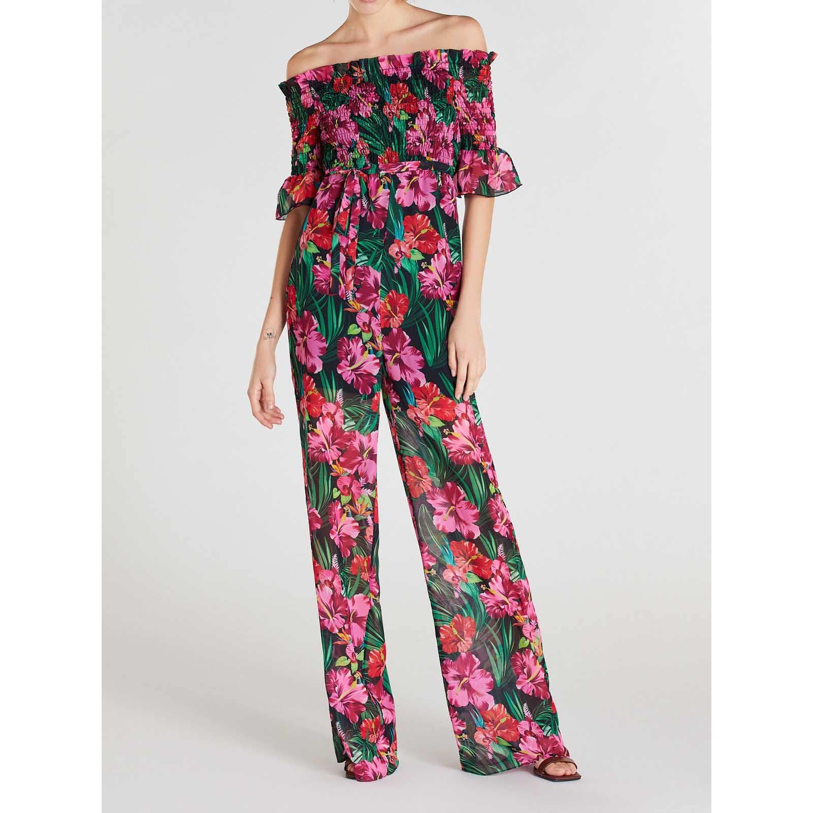 Fleurige jumpsuit van Patrizia Pepe. Deze kleurrijke jumpsuit heeft een all over bloemen print op een zwarte basis. De jumpsuit heeft een elastische body die je als boothals of met open schouders kunt dragen. De wijde broekspijpen, die gedeeltelijk gevoerd zijn, vallen lang.