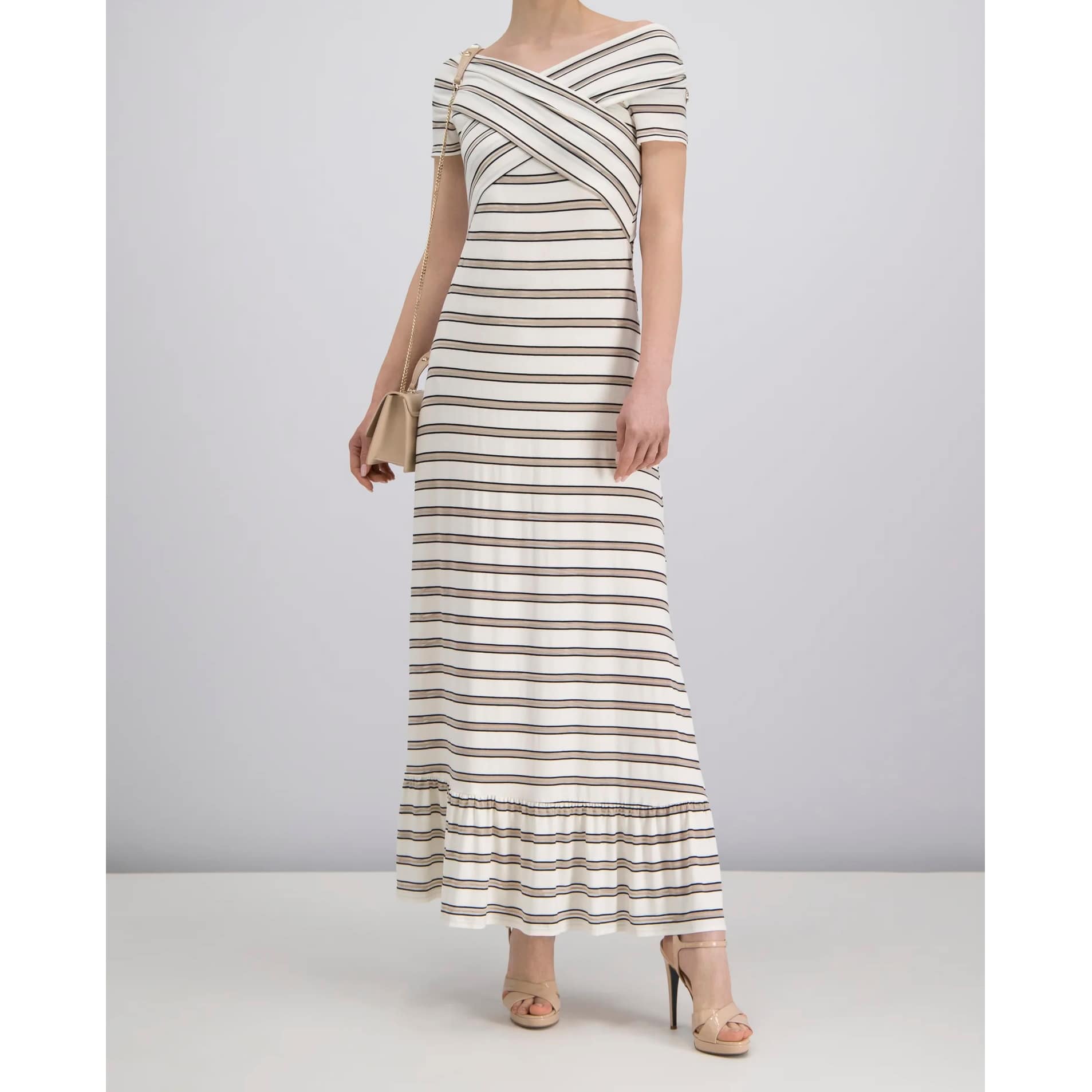 Maxi kleedje van Patrizia Pepe. Deze jurk is gemaakt van soepele crème kleurige stretch stof met zwart en beige strepen. De jurk heeft een gekruiste bovenzijde, voor en achter, met korte mouwen en een volant aan de onderzijde.