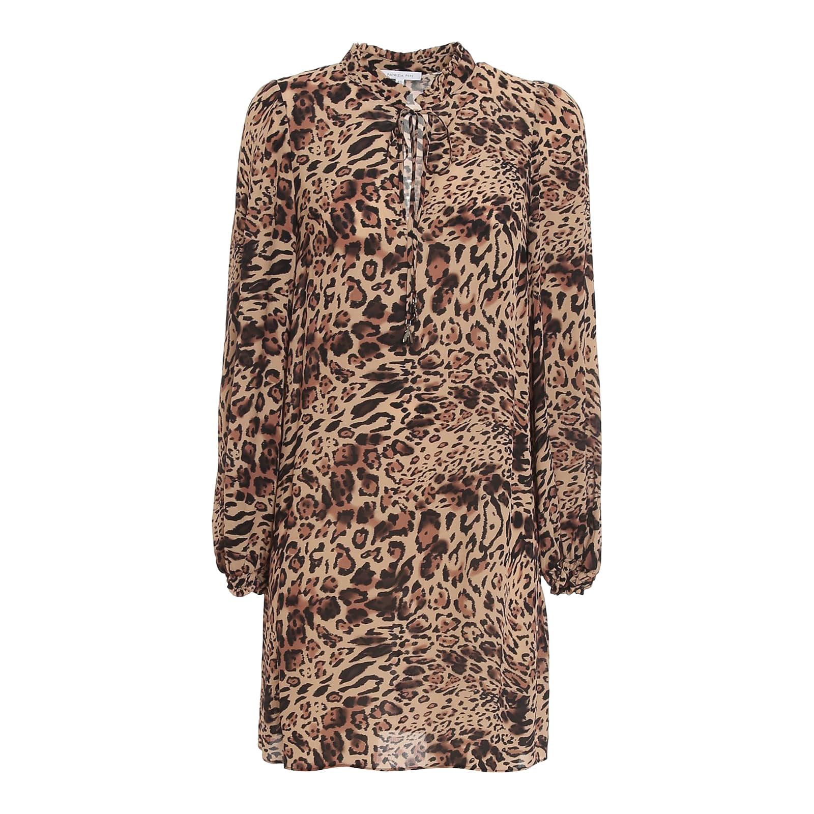 Kort kleedje van Patrizia Pepe. Deze jurk is gemaakt van een bruine stof met luipaard print en heeft lange mouwen. De jurk heeft een recht pasvorm, sluit met een strikje aan de voorzijde en heeft elastische manchetten.