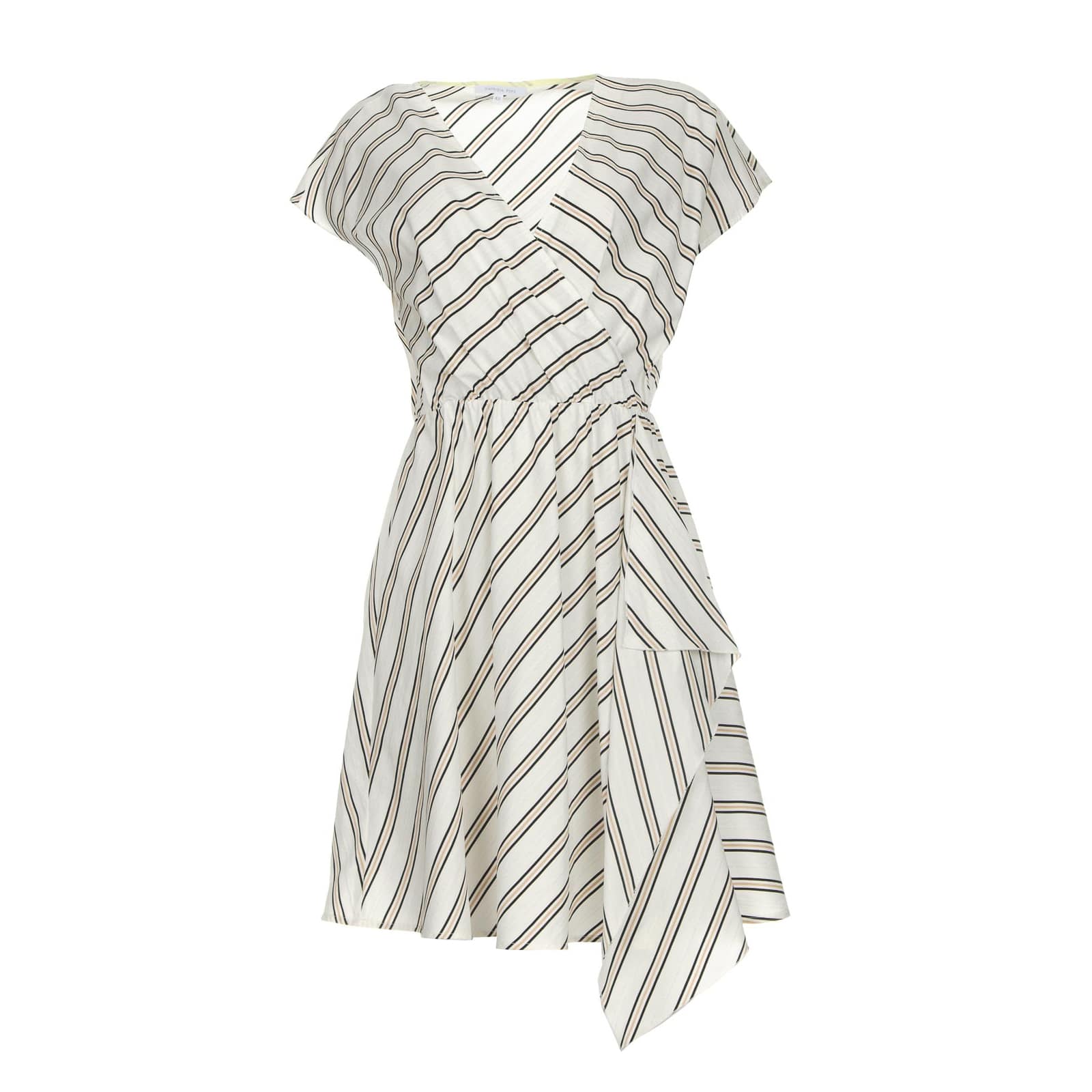 Kort kleedje van Patrizia Pepe. Deze jurk is gemaakt van een witte stof met zwarte, bruine en zilveren strepen. De jurk heeft een elastische taille, V-hals en een uitlopende rok met een overslag aan de zijkant.