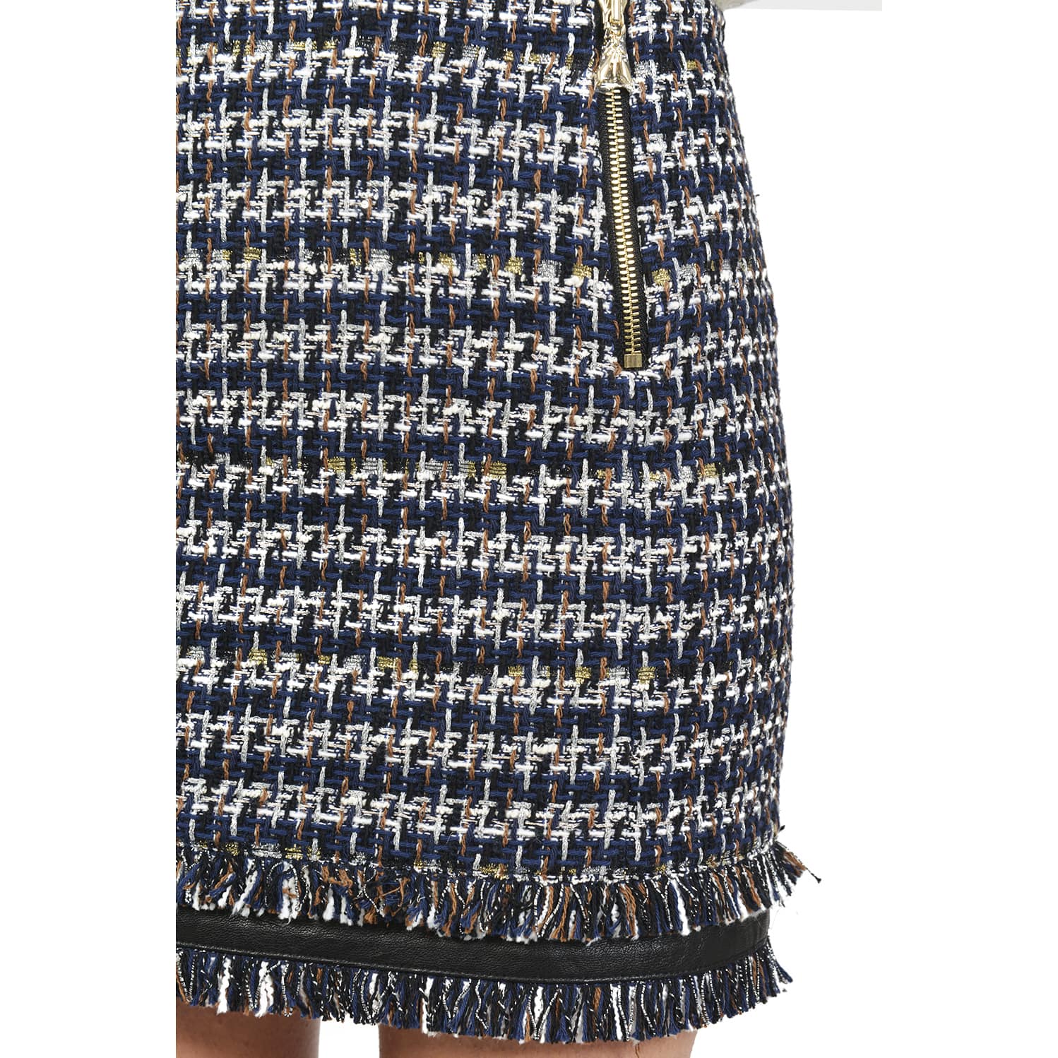 Korte rok van Patrizia Pepe. Deze mini rok is gemaakt van een tweed stof die is gemaakt uit donkerblauwe, zilveren, witte en bruine draden. De rok sluit met een dubbele zichtbare ritssluiting aan de voorzijde met het Patrizia Pepe logo en heeft franjes aan de zoom.