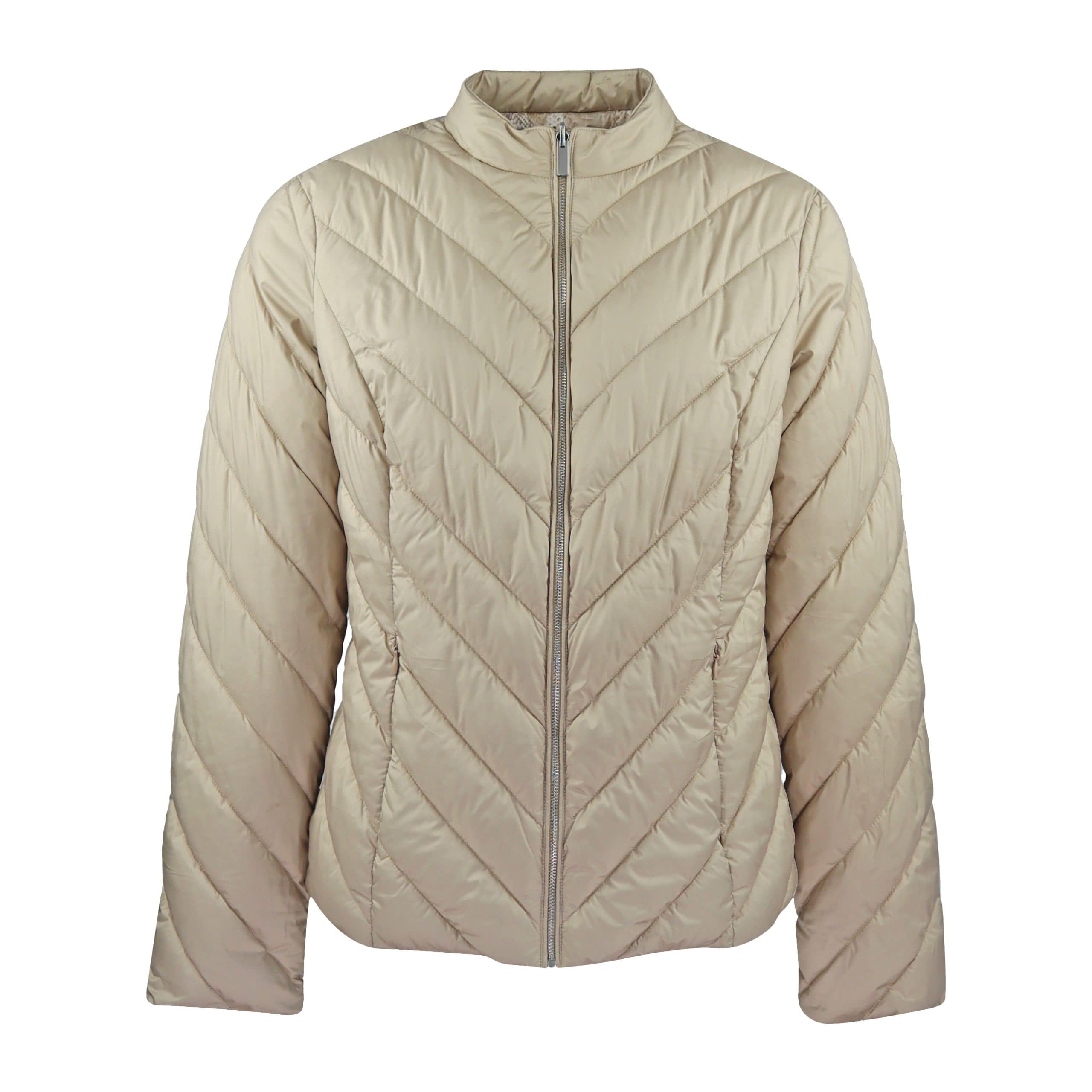 Beige jas van Pennyblack, model Agre. Dit licht gewicht jack is licht gewatteerd en sluit aan de voorzijde met een ritssluiting. Deze jas is omkeerbaar en heeft twee zakken die afgesloten worden met een ritsje.