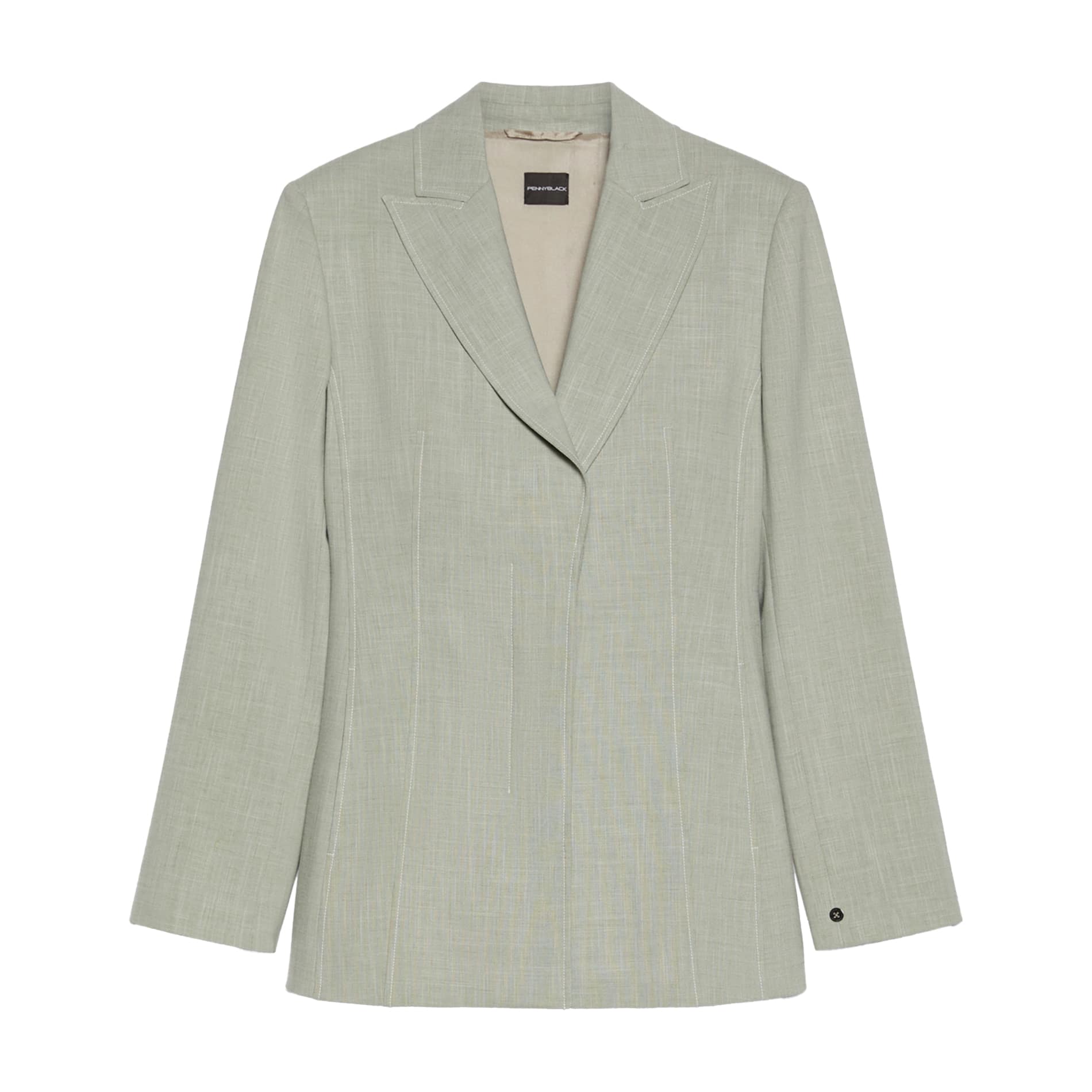 Groen, grijze blazer van Pennyblack, model Stuarda in sage. Dit jasje is gemaakt van een gemeleerde stretch stof, heeft een slim fit pasvorm en sluit aan de voorzijde met een verborgen knoopsluiting met drie knopen. De blazer heeft twee steekzakken aan de voorzijde en een splitje aan de achterzijde.