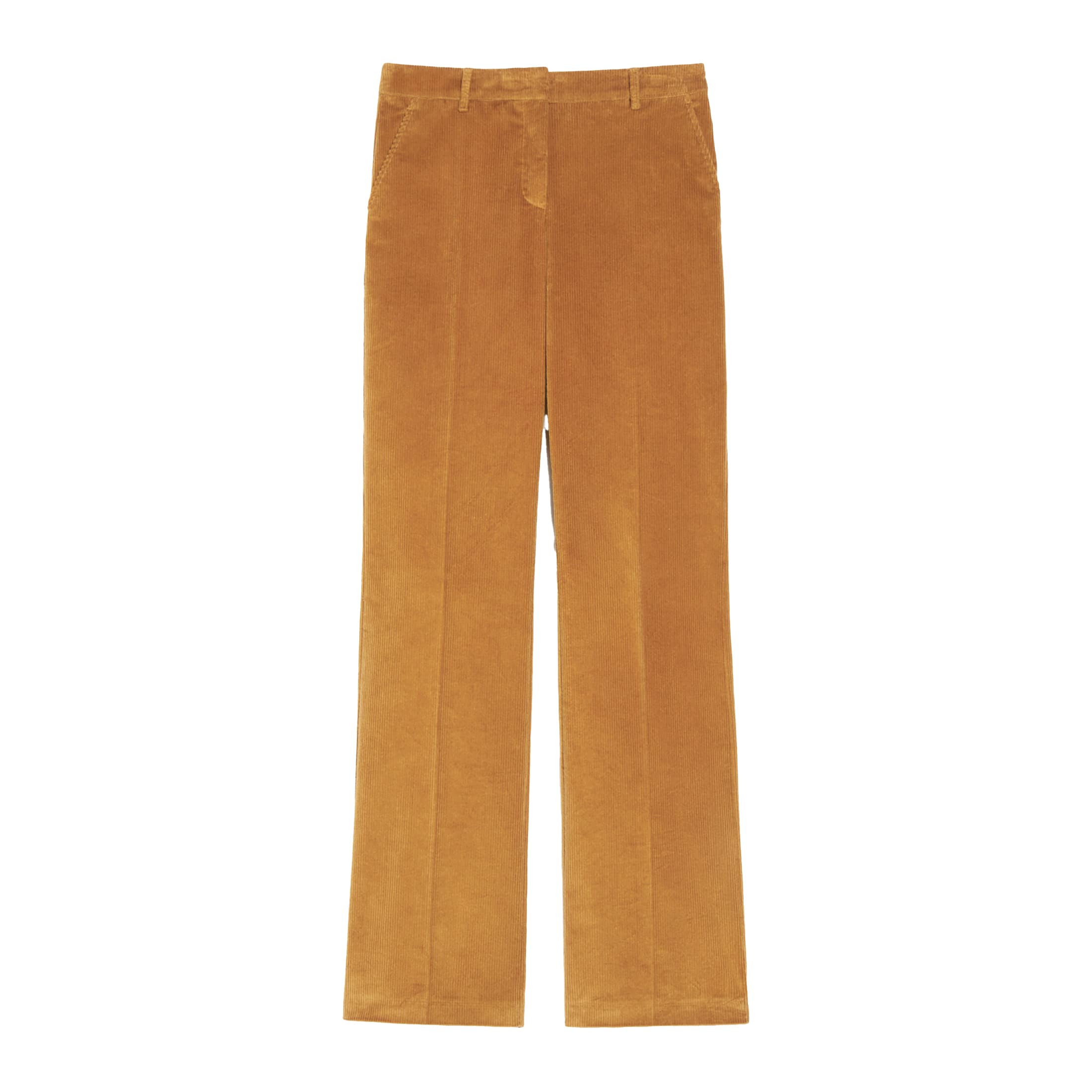 Ribfluwelen pantalon van Pennyblack, model straight-fit velvet trousers Obolo in senape (mosterd). Deze pantalon is gemaakt van een mosterd kleurige ribfluwelen stretch stof en heeft rechte broekspijpen. De pantalon sluit met een haakje, knoop en ritssluiting, heeft een hogere taille, twee steekzakken en twee paspelzakjes.