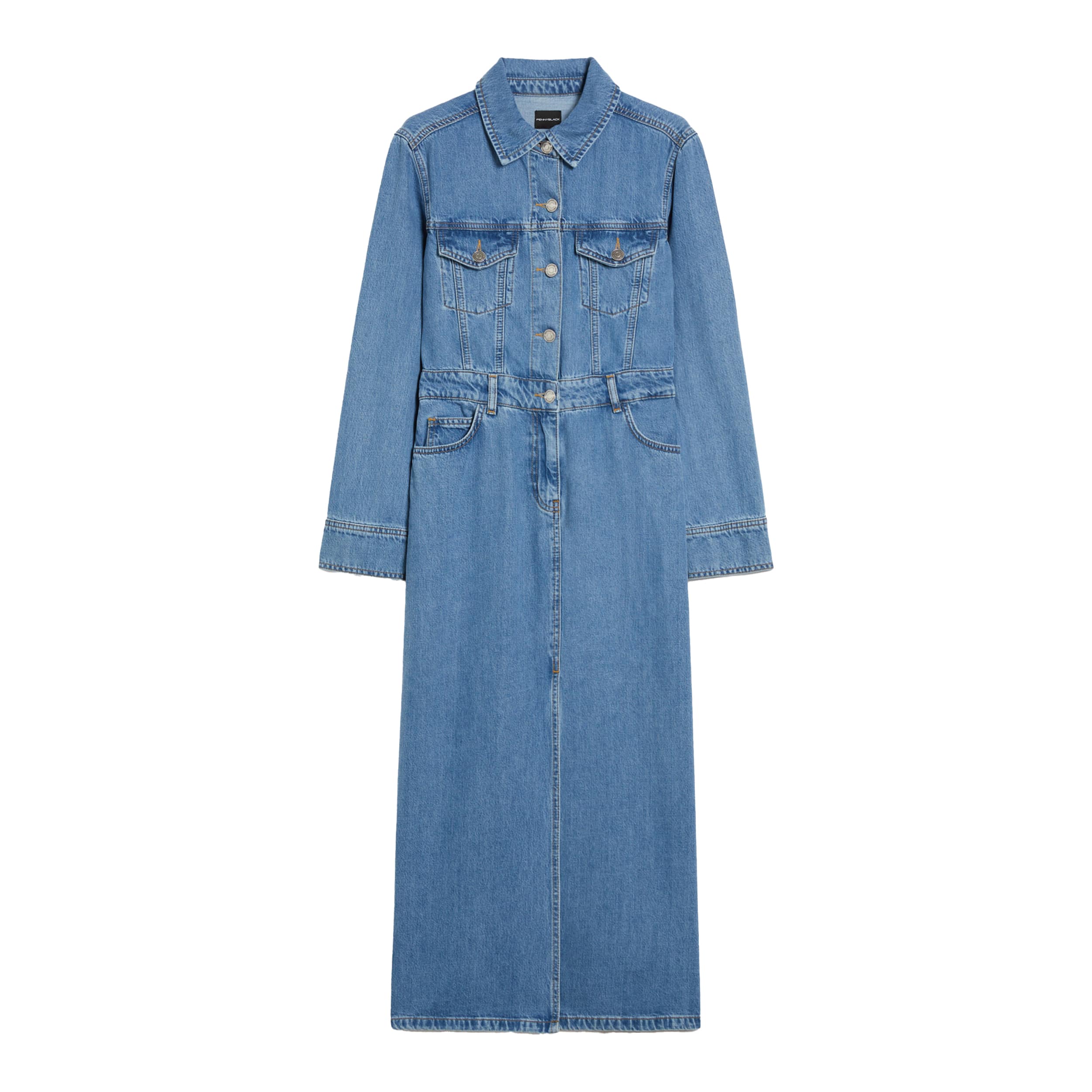 Blauwe denim jurk van Pennyblack, model lightweight denim shirt dress Libra in blu chiaro. Deze lange jurk is gemaakt van 100% denim en sluit met een knoopsluiting aan de voorzijde. De midi jurk heeft steekzakken, twee achterzakken, een split midden voor, klepzakjes, lange mouwen en valt op de kuiten.