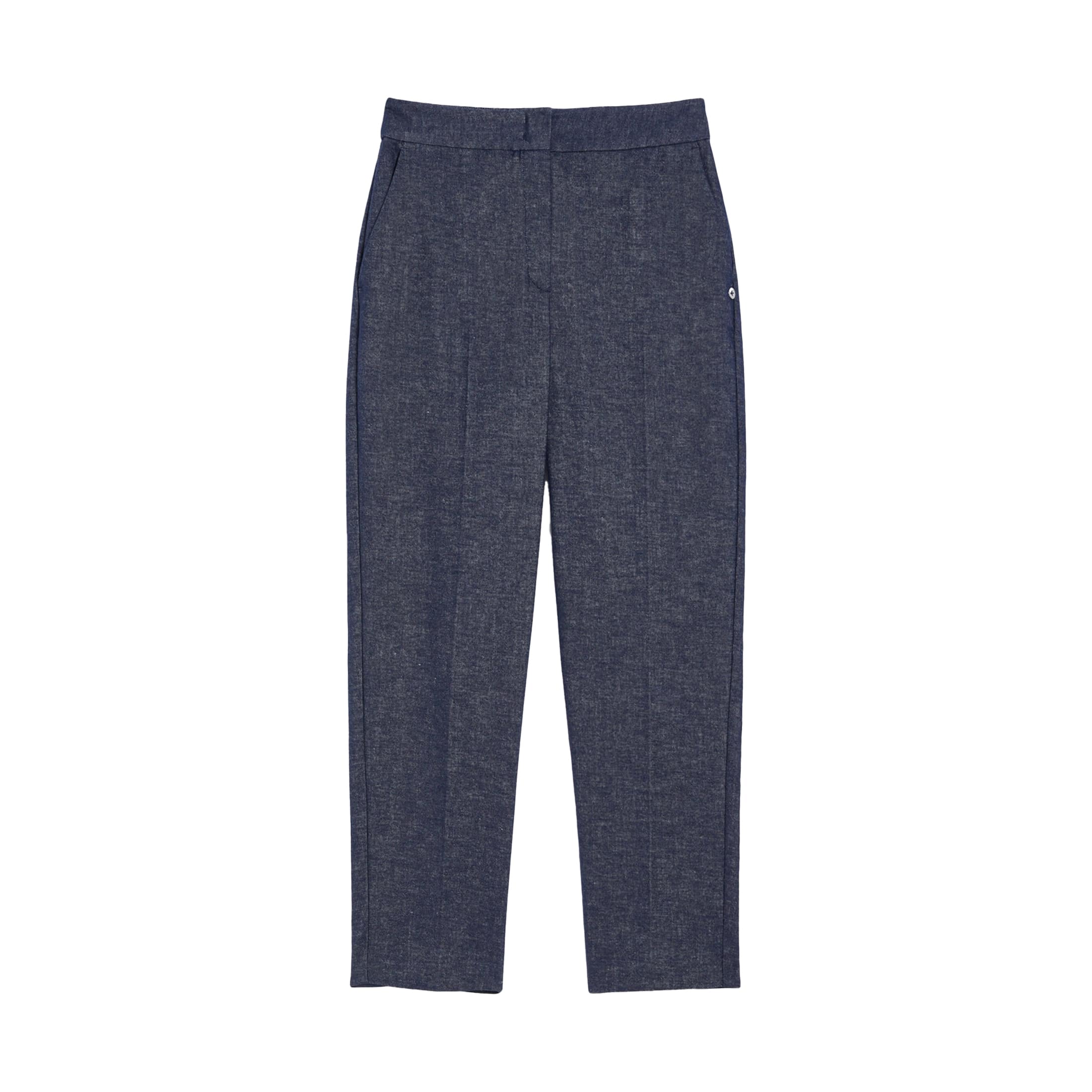 Denim look pantalon van Pennyblack, model Ralla in navy. Deze cropped pantalon is gemaakt van een katoen met linnen mix met een beetje stretch en heeft toelopende broekspijpen. De pantalon sluit met een knoop, haakjes en ritssluiting, heeft een mid-rise taille, twee steekzakken en twee paspelzakjes.