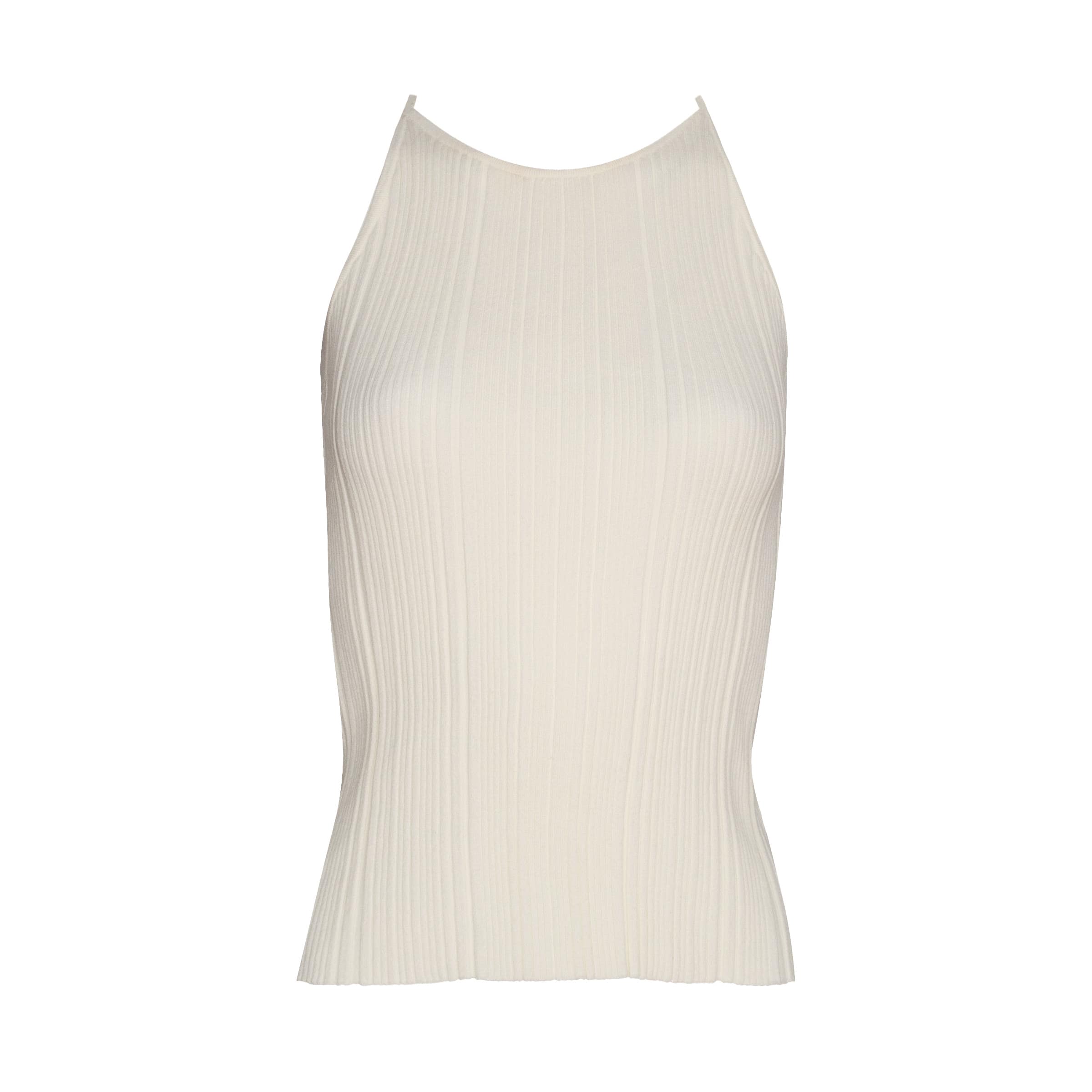Geribbelde top van Pennyblack, model Davide in off white. Deze top heeft een aansluitende pasvorm en is gemaakt van een geribbelde stretch stof. De top is mouwloos, heeft een ronde hals en een racer back.